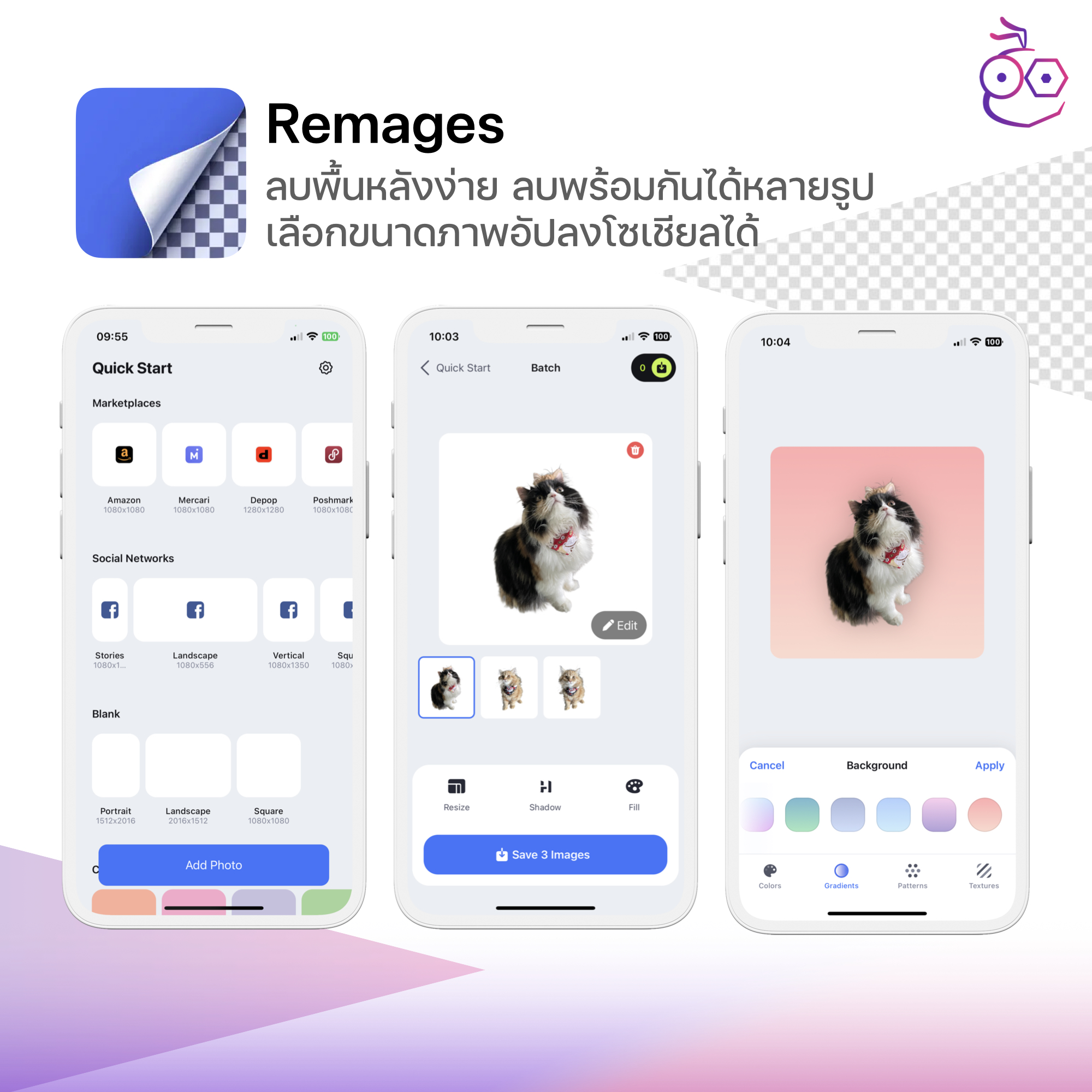 แอป Remages เป็นอีกหนึ่งแอปที่ลบพื้นหลังได้ง่าย ปรับแต่งพื้นหลังและขนาดของภาพเพื่อแชร์ลงโซเชียลมีเดียและ Marketplace ได้เลย รองรับการลบพื้นหลังพร้อมกันหลายรูปในครั้งเดียว [ดาวน์โหลดแอปที่นี่]