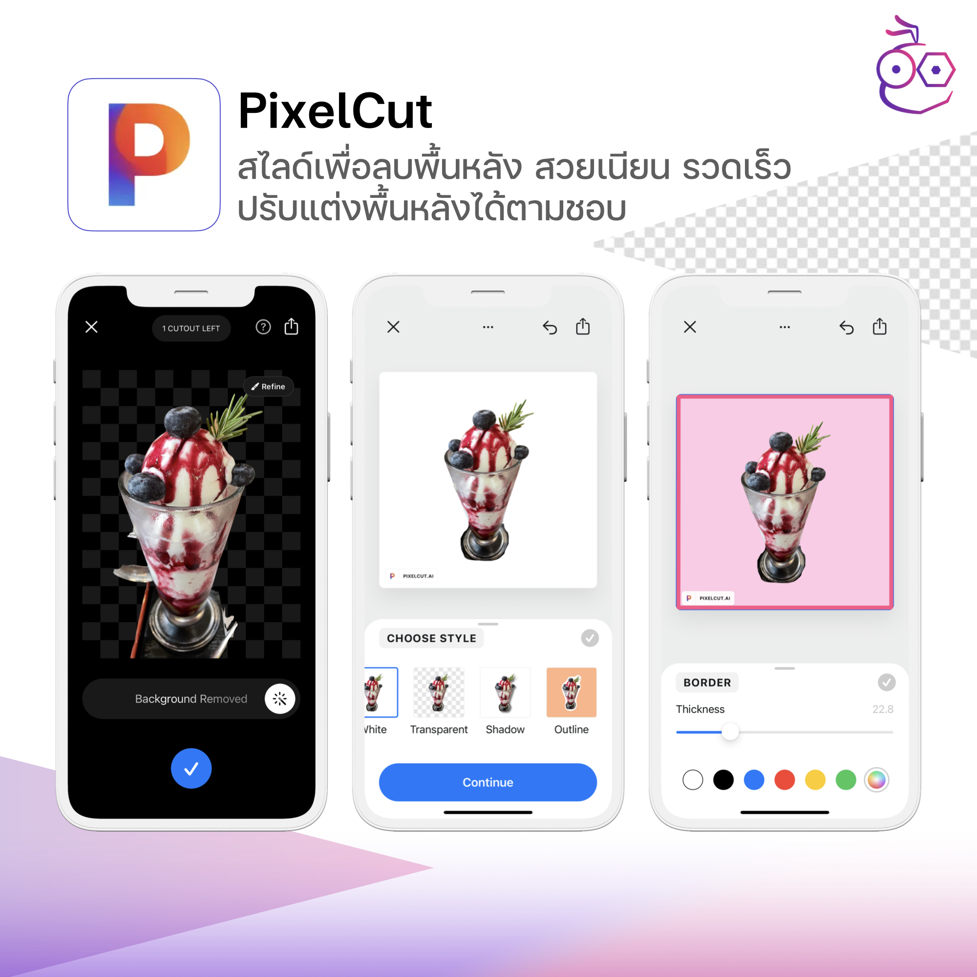 แอป PixelCut สามารถลบพื้นหลังอัตโนมัติได้เนียนมากและรวดเร็วด้วย แค่เลือกรูป สไลด์ พื้นหลังก็จะถูกตัดทันที สามารถปรับแต่งสีพื้นหลัง เงา และขนาดของรูปภาพตามโซเชียงมีเดียได้ รองรับการปรับแต่งพร้อมกันหลายรูป (สำหรับ Pro) [ดาวน์โหลดแอปที่นี่]