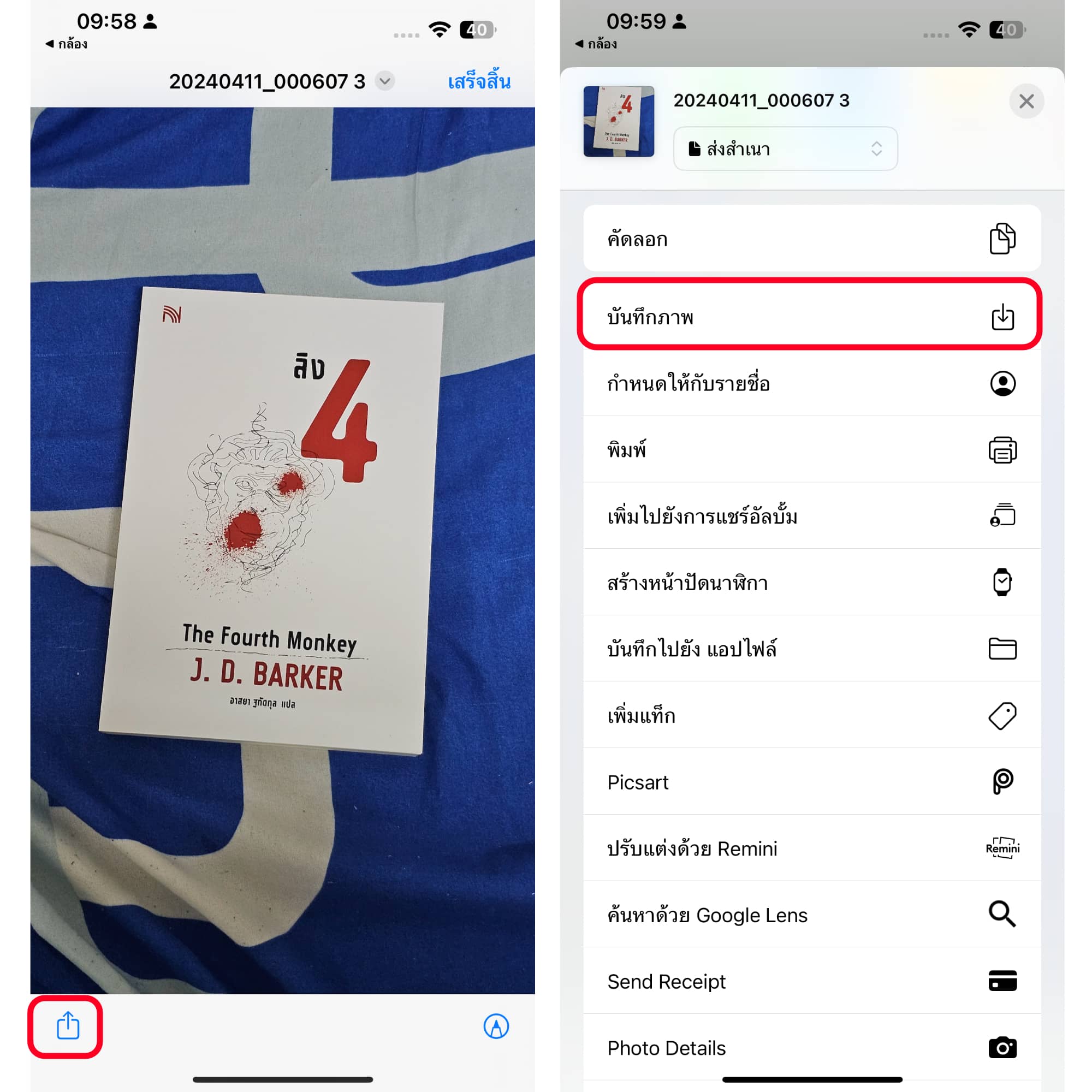 กด แชร์ > บันทึกภาพ เพียงเท่านี้รูปที่ถูกแชร์มาจาก Samsung ก็จะมาอยู่ใน iPhone ของเราแล้ว