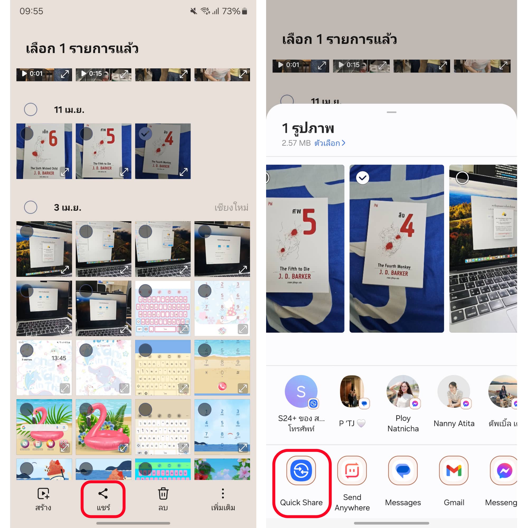 เข้ามาที่แกลอรี่หรือเข้าไปที่ไฟล์ต่าง ๆ ที่ต้องการแชร์ จากนั้นพอเลือกเสร็จให้กด “แชร์” แล้วกด “Quick Share”