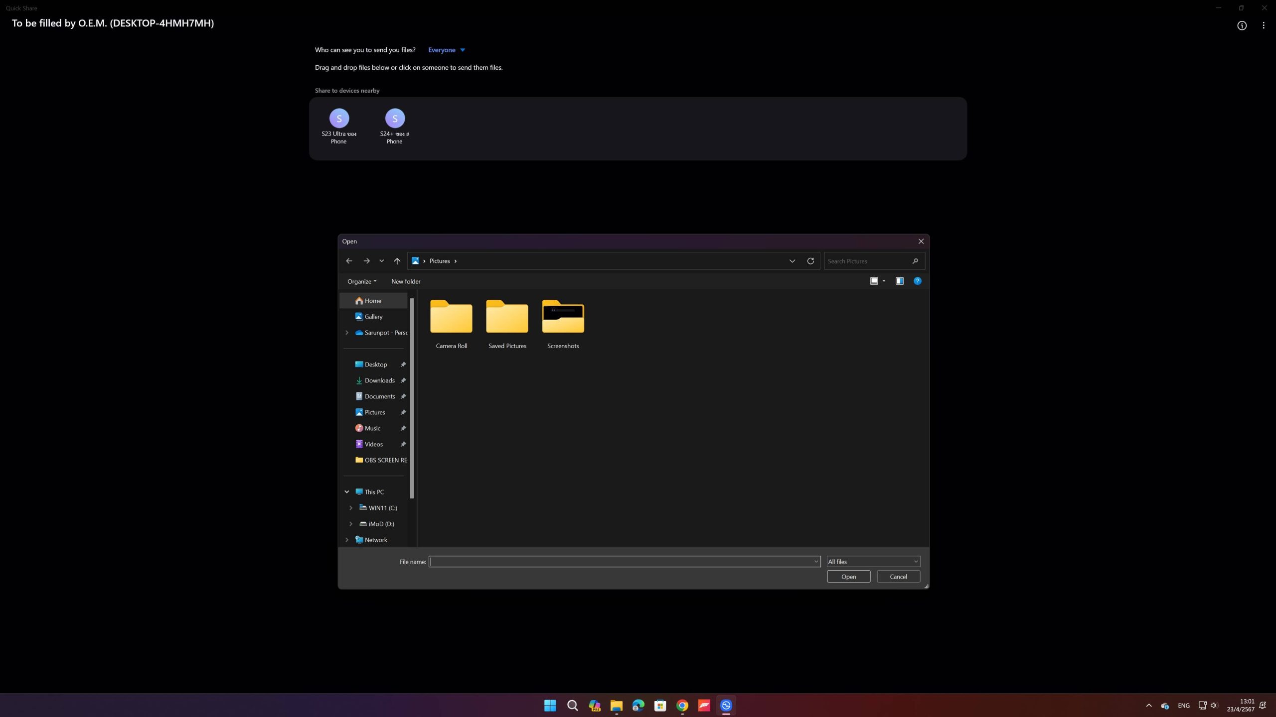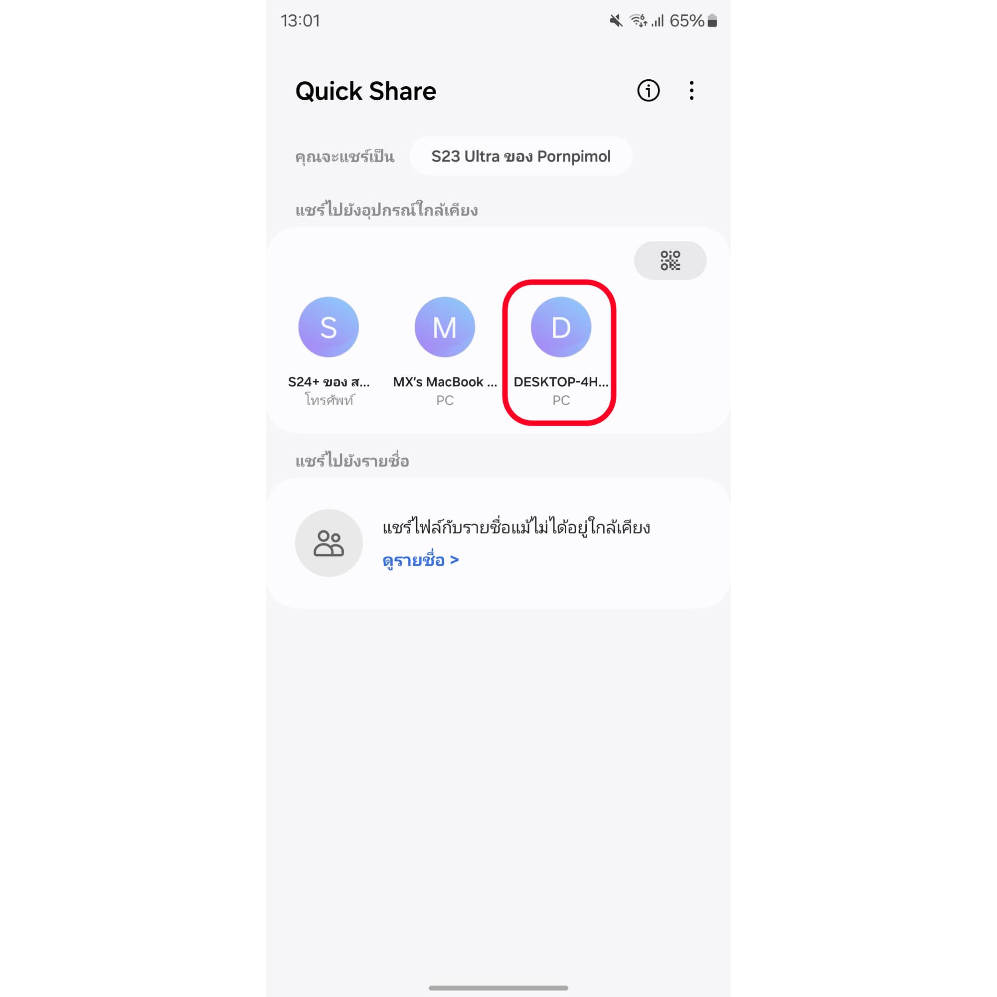 แล้วให้เราเลือกส่งไฟล์จาก Samsung ได้เลย ก็จะเห็นว่ามีอุปกรณ์ PC เพิ่มขึ้นมาตามรูปด้านล่าง ให้กด “ชื่อ PC ของเรา” เพื่อแชร์รูป วิดีโอ หรือไฟล์ต่าง ๆ ไปหา PC