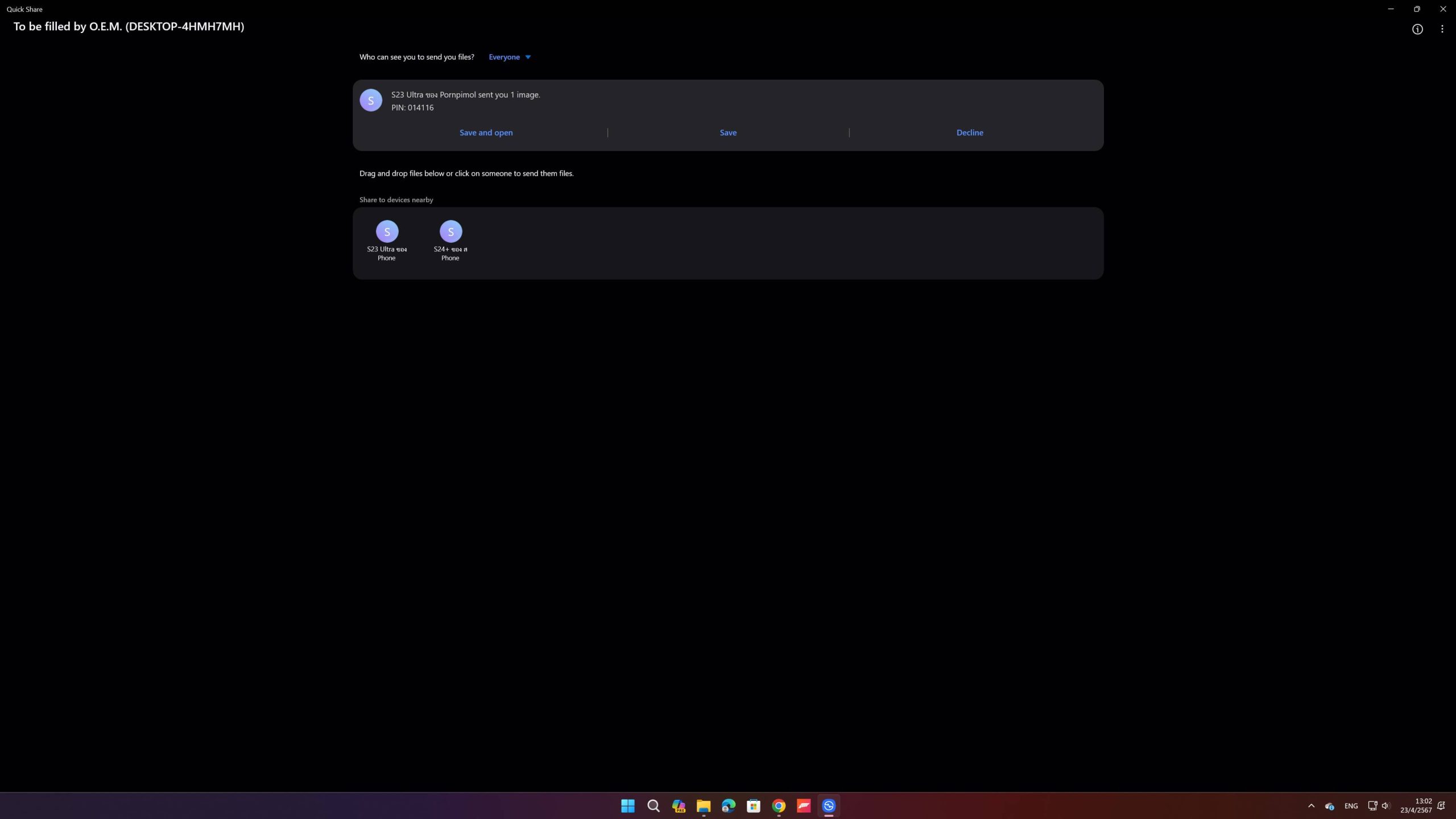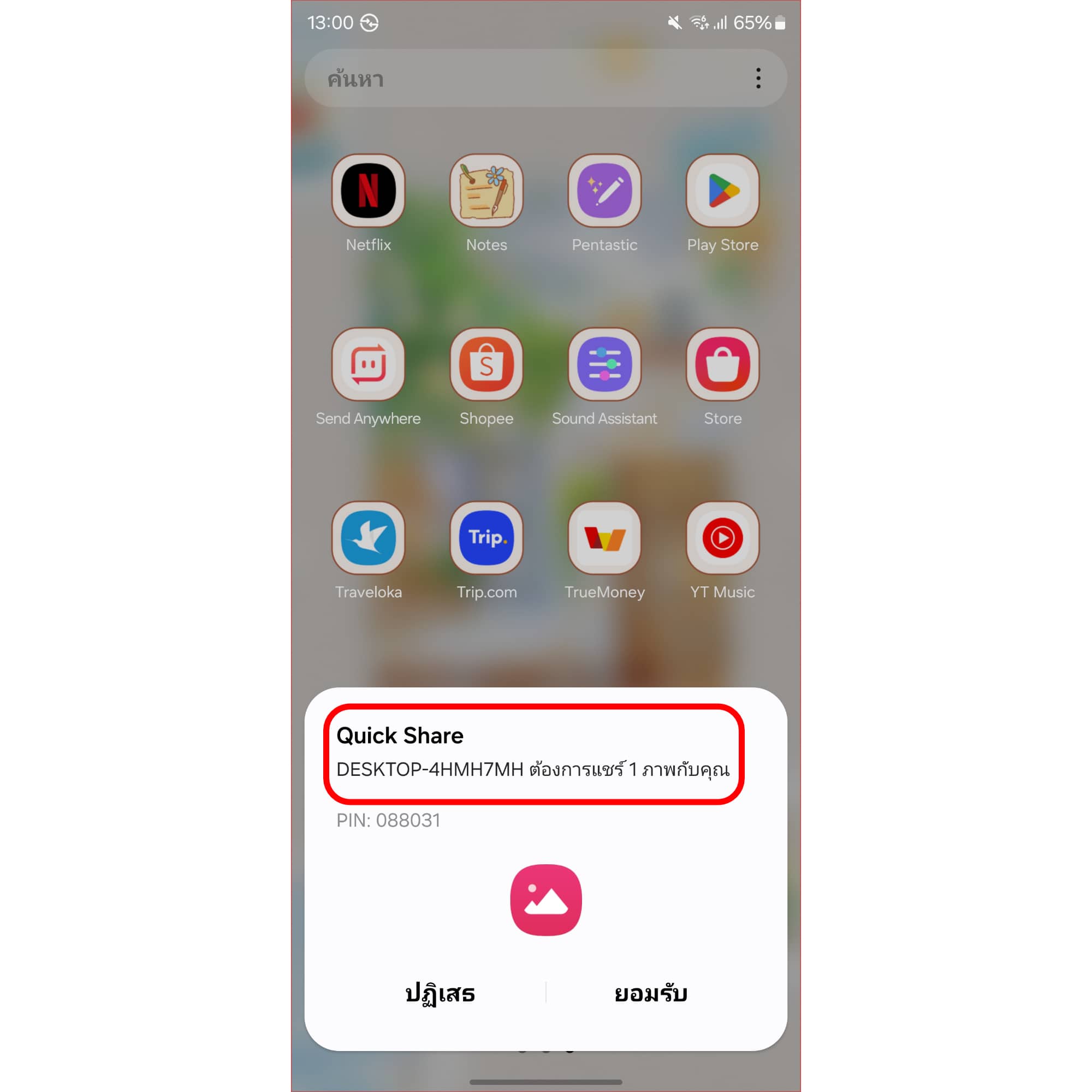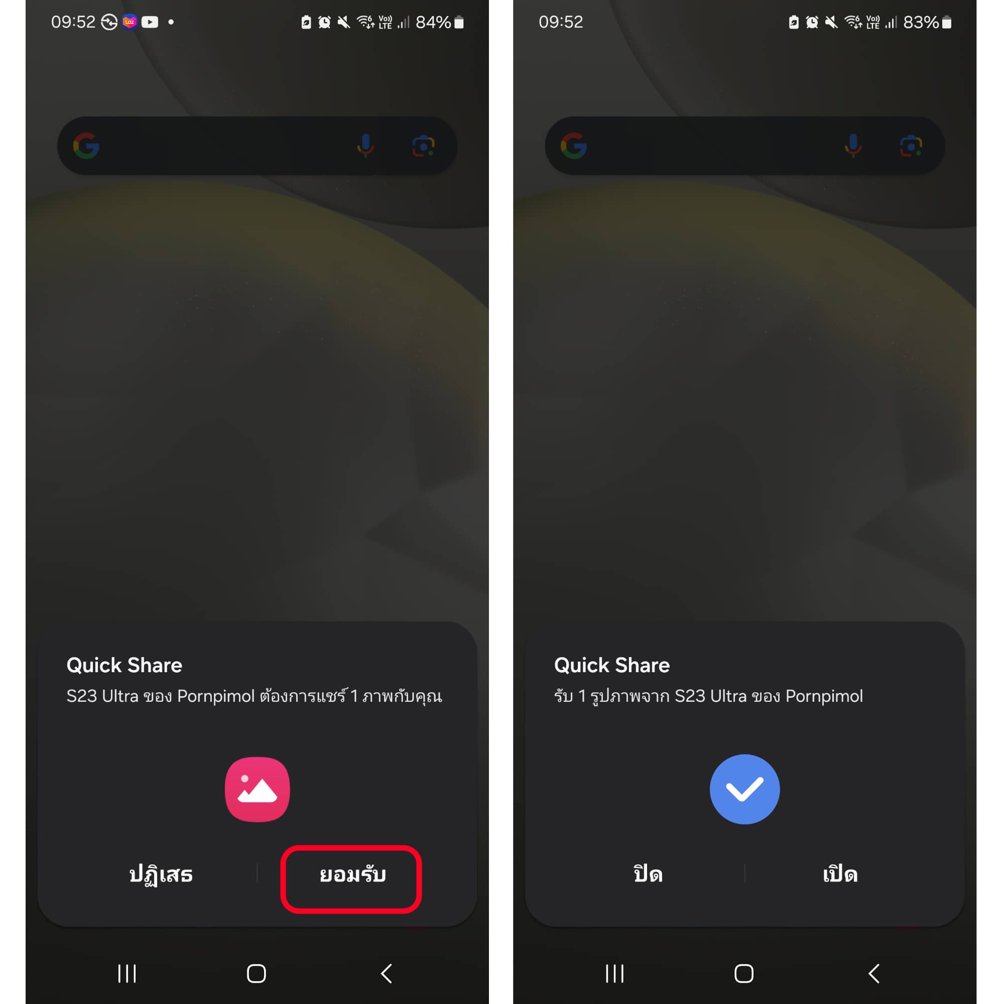 พอเราแชร์ไฟล์ไปหา Samsung อีกเครื่องแล้ว ก็จะมีแจ้งเตือนเด้งมาใน Samsung เครื่องที่รับไฟล์ ว่า “มีการแชร์ไฟล์มาจากอีกเครื่อง” ให้เรากด “ยอมรับ” แค่นี้ไฟล์ที่แชร์มาก็จะมาอยู่ในเครื่องที่รับแล้ว