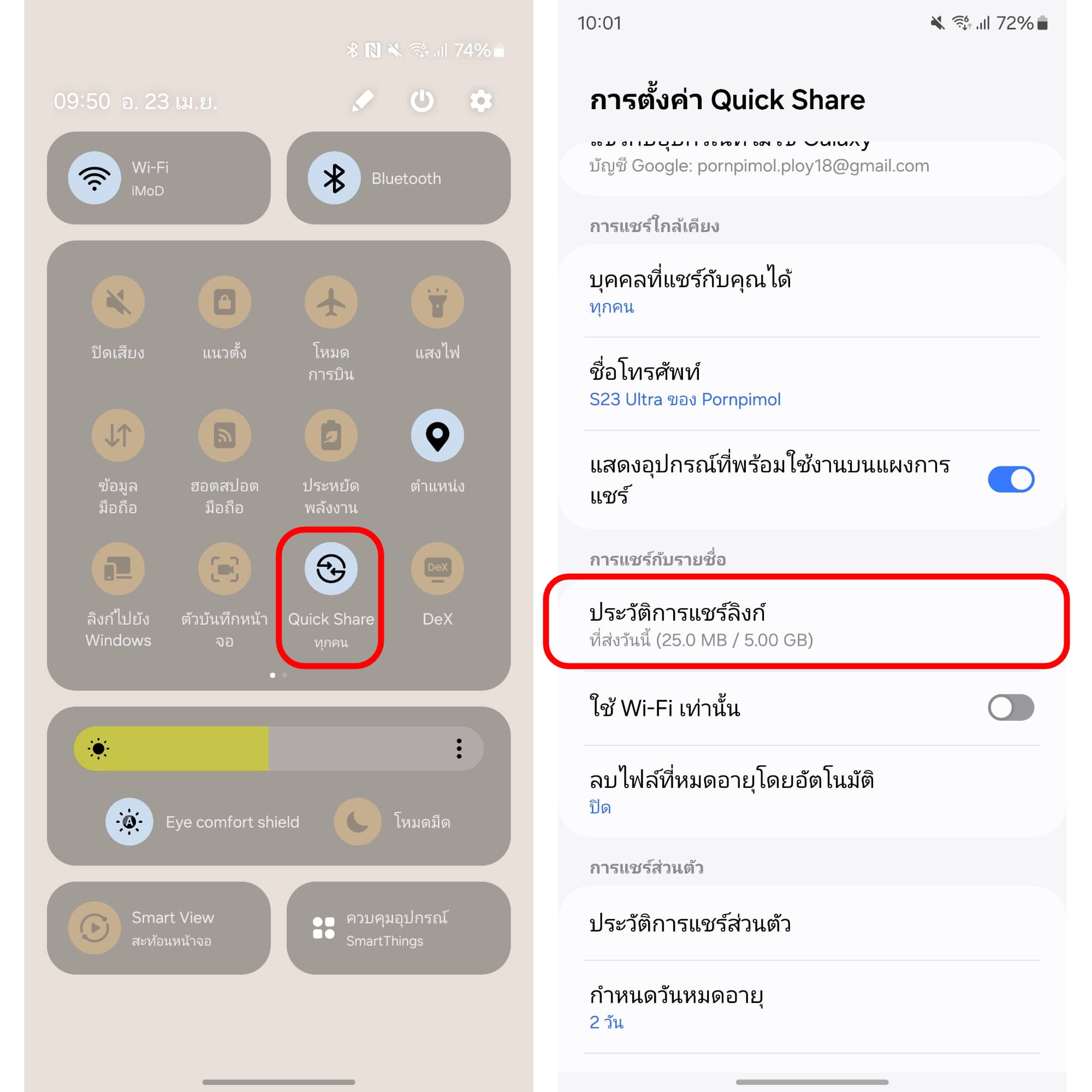 แต่การแชร์ไฟล์แบบ QR Code หรือแชร์ลิงก์ จะสามารถแชร์ได้มากสุดต่อวัน 5 GB และมีวันหมดอายุในการดูไฟล์ที่ถูกแชร์มาด้วย โดยที่เราสามารถเข้าไปเช็คดูได้โดยเข้าไปที่แผงควบคุมกดค้าง “Quick Share” เราก็จะสามารถดูได้ว่าแชร์ไฟล์ต่าง ๆ ผ่าน QR Code หรือแชร์ลิงก์ไปเท่าไหร่แล้ว