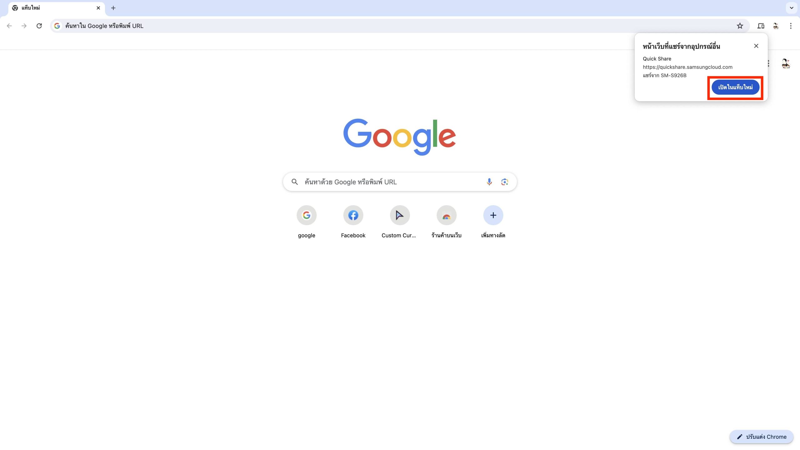 เพียงเท่านี้ลิงก์ที่เราแชร์มาก็จะแจ้งเตือนบน Chorme ให้เรากด “เปิดในแท็บใหม่” ได้เลย