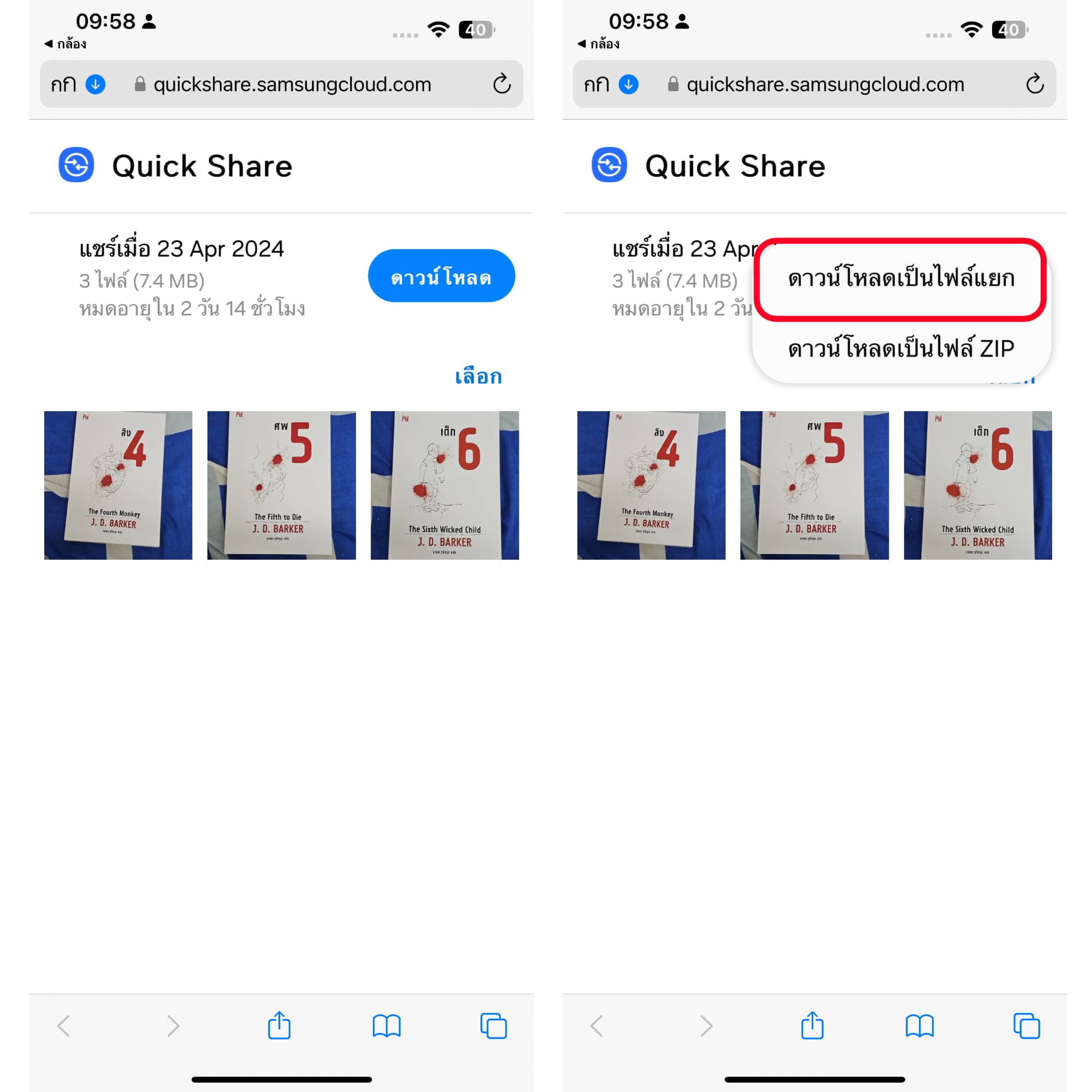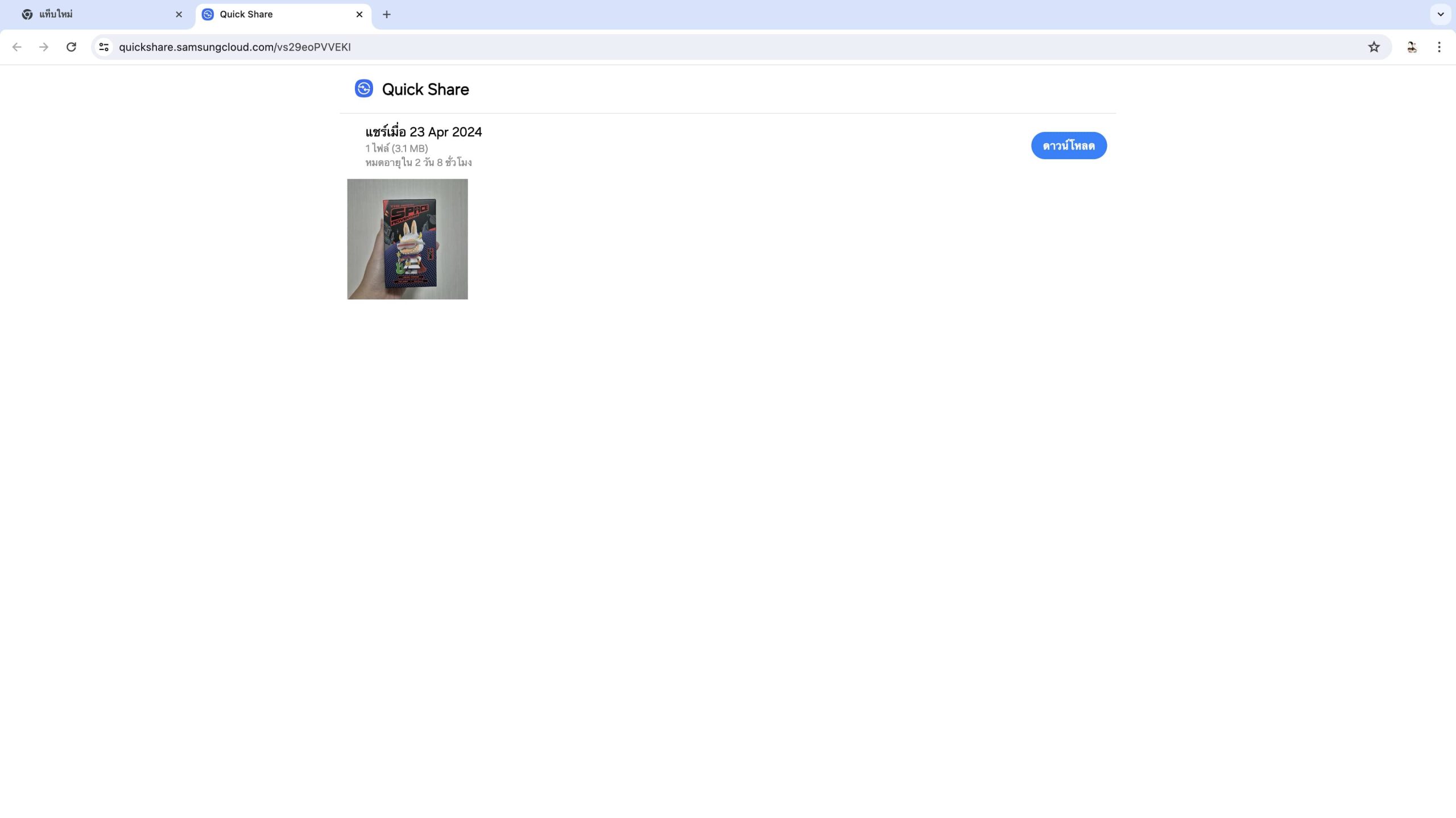 พอสแกนแล้วจะเข้ามาที่เว็บ Quickshare ที่เราได้แชร์ไฟล์ไว้ โดยไฟล์จะถูกอัปโหลดแล้วเก็บไว้บน Samsung Cloud ซึ่งเราสามารถเลือกดาวน์โหลดได้ 2 แบบ คือ ดาวน์โหลดไฟล์แยก หรือดาวน์โหลดเป็นไฟล์ ZIP แต่ทีมงานจะเลือกโหลดเป็นไฟล์แยก