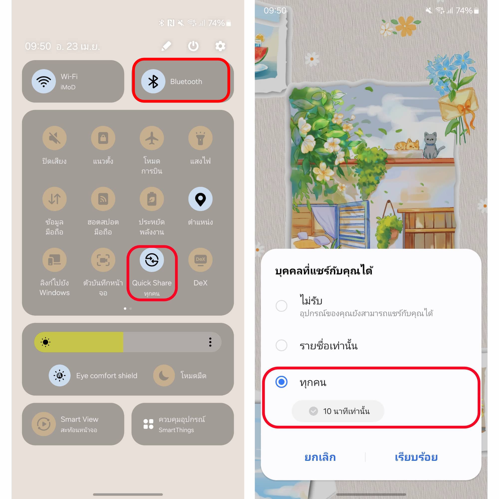 ก่อนจะใช้งานฟีเจอร์ Quick Share ให้เราเข้าไปที่แผงควบคุมเปิด “Bluetooth” แล้วกดเปิด “Quick Share” เลือก “ทุกคน” (เราสามารถกด “10 นาทีเท่านั้น” เพื่อเปิดการแชร์ทุกคนแค่ 10 นาทีได้ด้วยนะ) โดยต้องเปิดไว้ทั้ง 2 เครื่อง ทั้งเครื่องที่ต้องการแชร์และอีกเครื่องที่ต้องการรับ