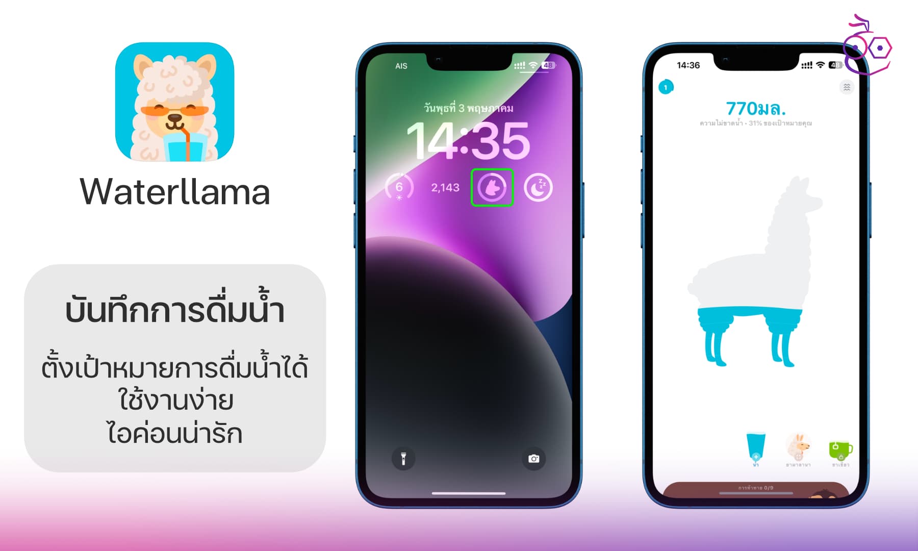 ดาวน์โหลด : https://apps.apple.com/us/app/water-tracker-waterllama/id1454778585