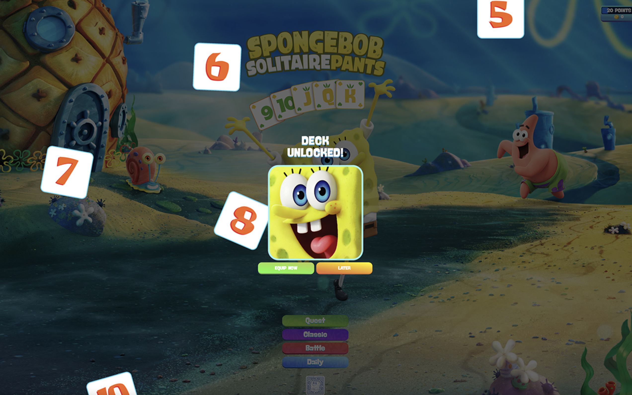 เกมโซลิแทร์รูปแบบใหม่ในสามโหมดกับ Spongebob และผองเพื่อน ผจญภัยผ่านโหมด Quest ที่แต่ละเลเวลมาพร้อมกับการท้าทายแบบใหม่ในสไตล์ Bikini Bottom ที่ทุกคนรู้จัก ผู้เล่นจะต้องทำตามเป้าหมายต่างๆ อย่างการสร้าง Krabby Patty หรือจับแมงกะพรุน พร้อมกับการวางไพ่ให้ถูกลำดับ