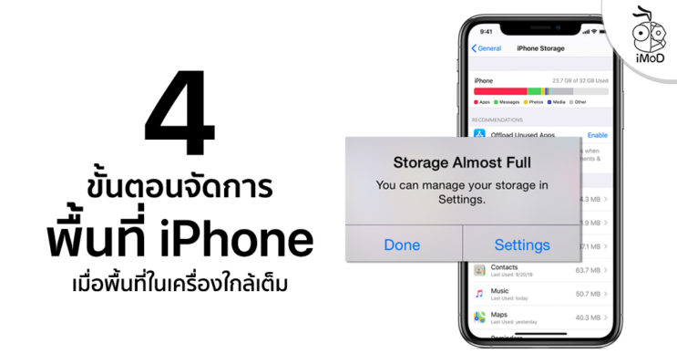 เมื่อเราใช้งาน iPhone ทุกวัน ข้อมูลต่าง ๆ ก็ต้องเพิ่มขึ้น ไม่ว่าจะเป็นรูปภาพ วิดีโอ แอป ไฟล์เอกสารต่าง ๆ ที่เก็บไว้ใครเครื่องก็เริ่มจะเต็มพื้นที่เก็บหรือหน่วยความจำบน iPhone เมื่อวันหนึ่งเราพบกับข้อความแจ้งเตือนว่า “พื้นที่จัดเก็บใกล้เต็ม” มาชมกันว่าเราควรทำอย่างไรบ้าง