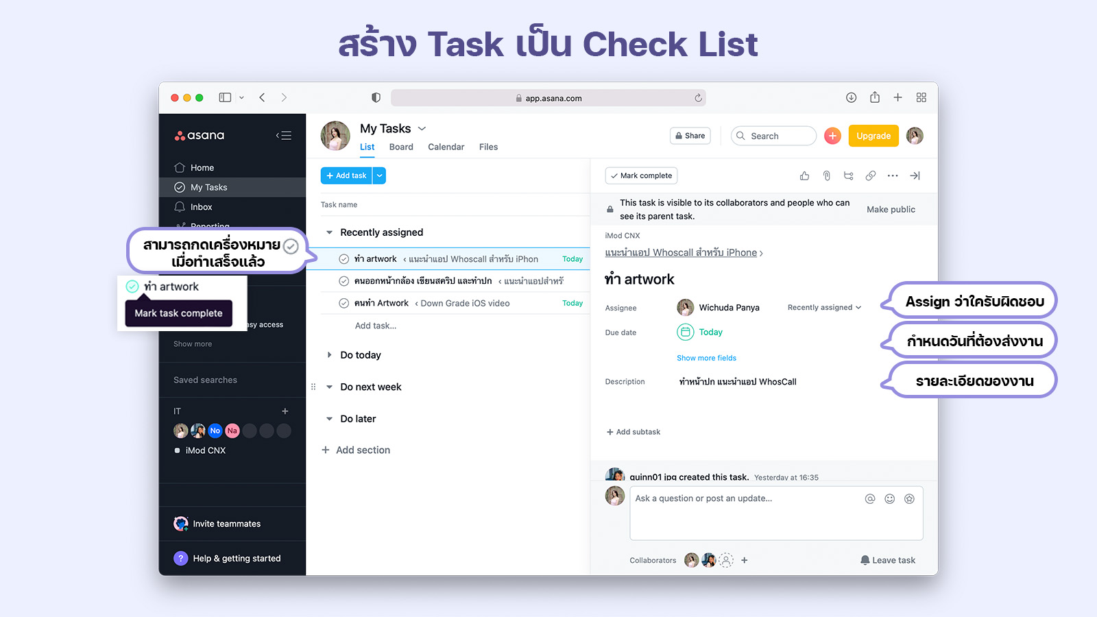 แอป Asana เป็นแอปที่สามารถทำให้ทีมงานสามารถทำงานร่วมกันได้ ภายในแอปเราสามารถสร้าง Task เป็น Check List ว่าเรามีงานอะไรบ้าง สามารถ Assign คนที่รับผิดชอบงานนั้น ๆ และสามารถ กำหนดวันทำงานได้ด้วย