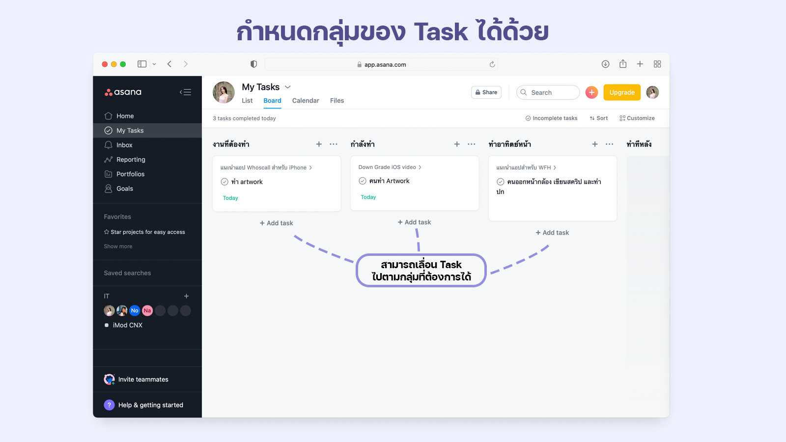 และเราสามารถกำหนดกลุ่มของ Task ได้ด้วย เช่น สิ่งที่ต้องทำ, สิ่งที่กำลังทำ และงานที่เสร็จแล้ว