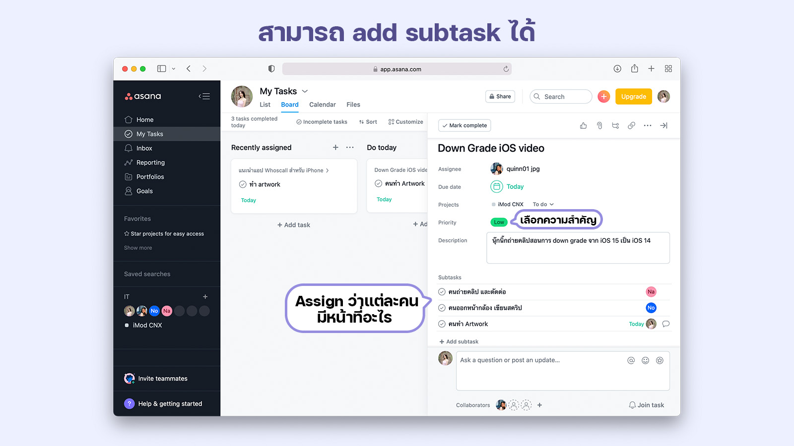 เวลาเรากดเข้าไปใน Task นั้นๆ ก็จะเห็นว่า Task นี้ Assign ให้ใคร กำหนดวันส่งวันไหน เป็นโปรเจคอะไร ความสำคัญระดับไหน สามารถเพิ่มรายละเอียดของโปรเจคได้ด้วย และสามารถ add subtask หรือ task ย่อยว่าใครมีหน้าที่อะไรใน Task นั้นๆ