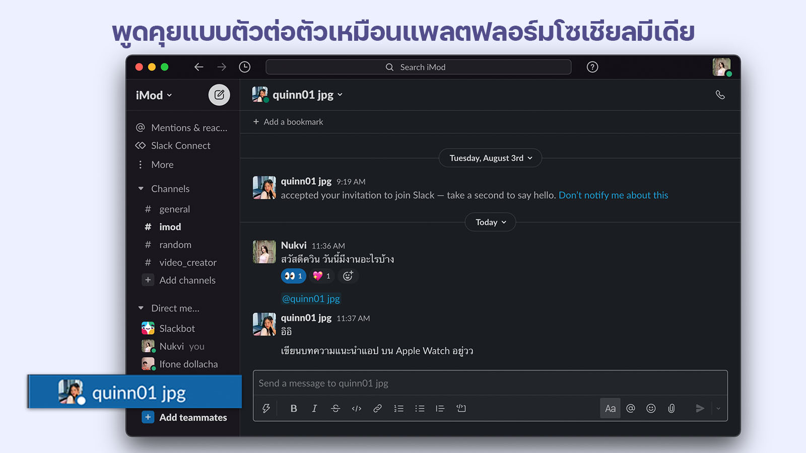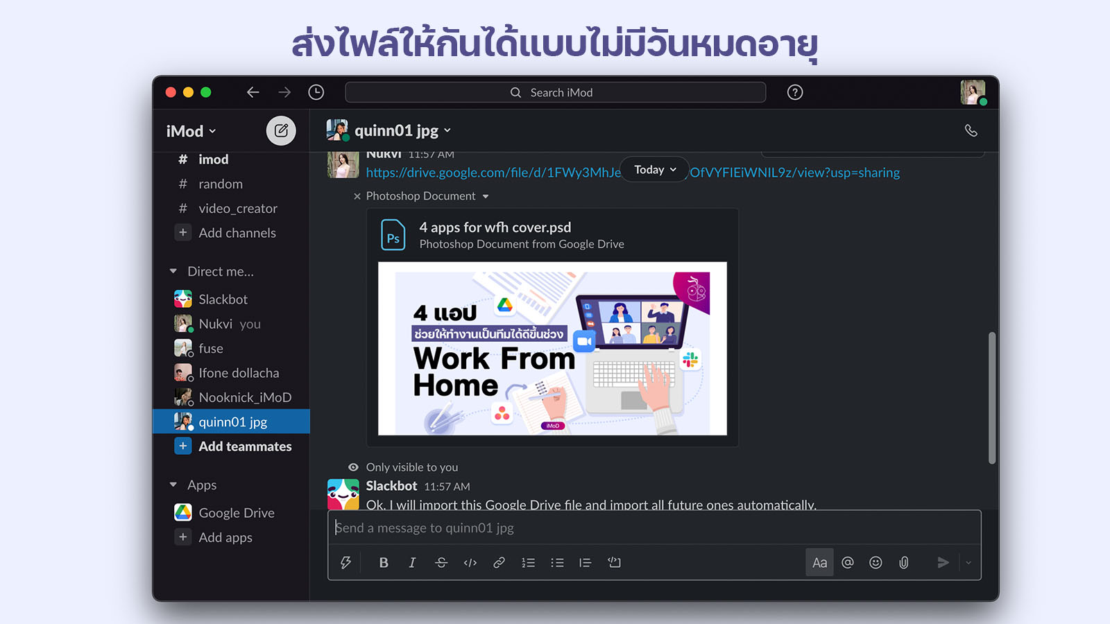 ในเวลาที่ Work From Home การสื่อสารกันในทีมให้เข้าใจจึงเป็นสิ่งที่สำคัญมาก แอป Slack เราสามารถพูดคุยแบบตัวต่อตัวเหมือนแพลตฟลอร์มโซเชียลมีเดียเลย หากเรามีโปรแกรมที่เราใช้เฉพาะคุยงาน เราไม่ต้องกังวลว่าจะมีข้อความโฆษาหรือข้อความอื่น ๆ มารวมเยอะไปหมด ทำให้หาแชทเฉพาะแชทงานได้รวดเร็วมากขึ้น