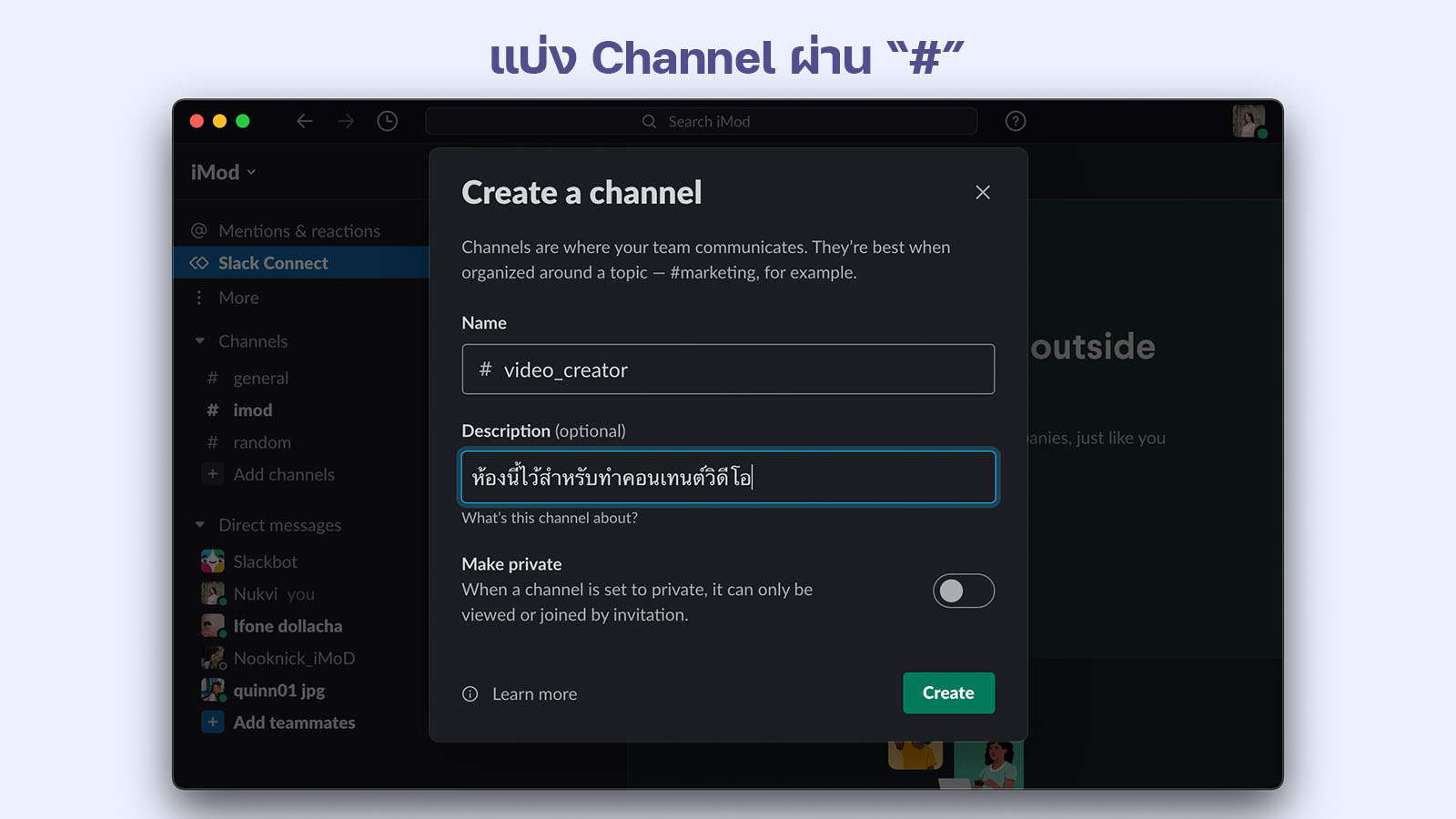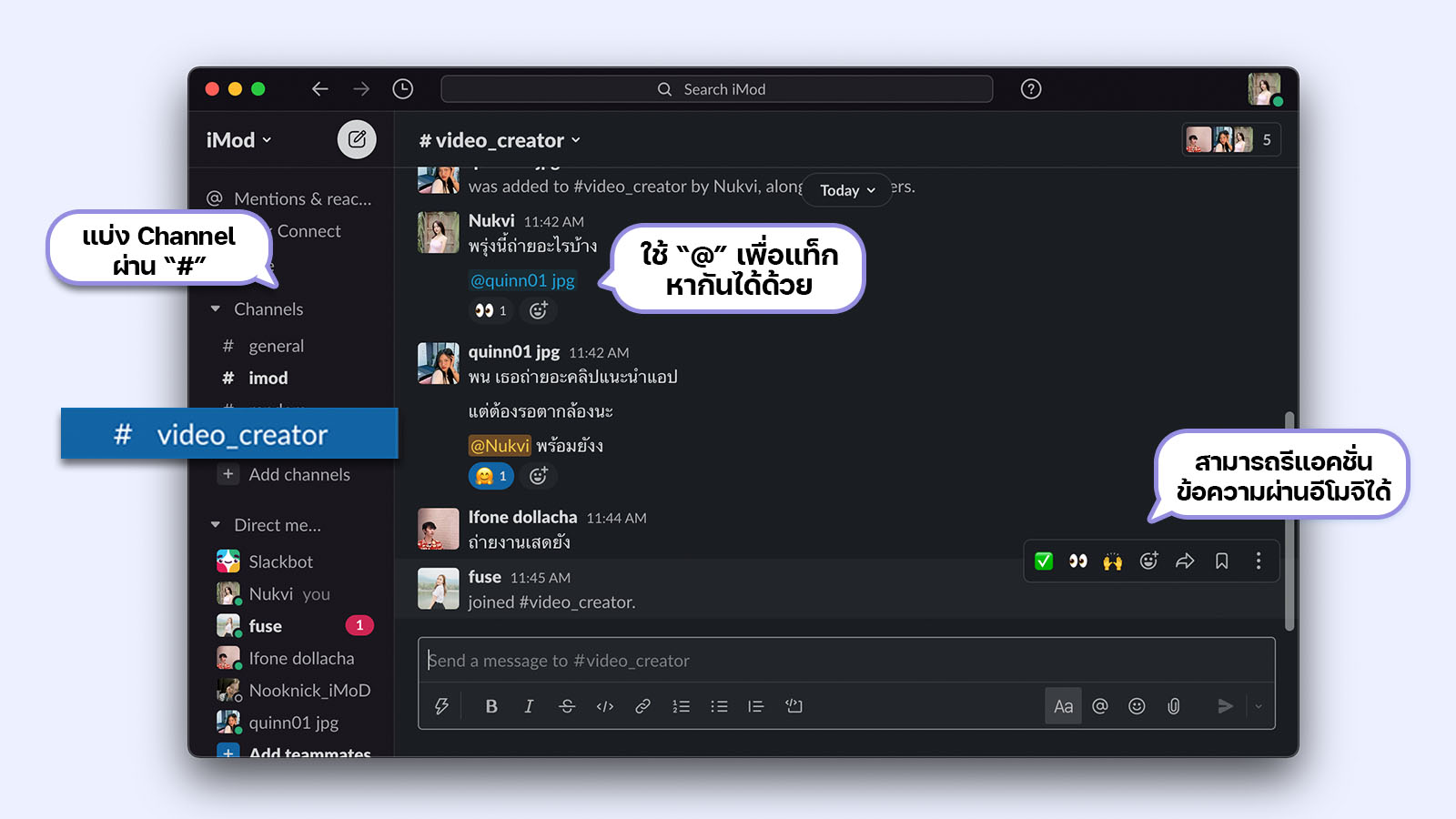 นอกจากนี้ Slack ยังสามารถแบ่ง Channel ผ่าน “#” ตามต้องการอีกด้วย อย่างเช่น เราจะแยกห้องแชทเป็นแต่ละโปรเจกต์ ใครมีหน้าที่รับผิดชอบกับทีมไหนก็สามารถอัปเดตได้ผ่านแฮชแท็กนั้นได้เลย