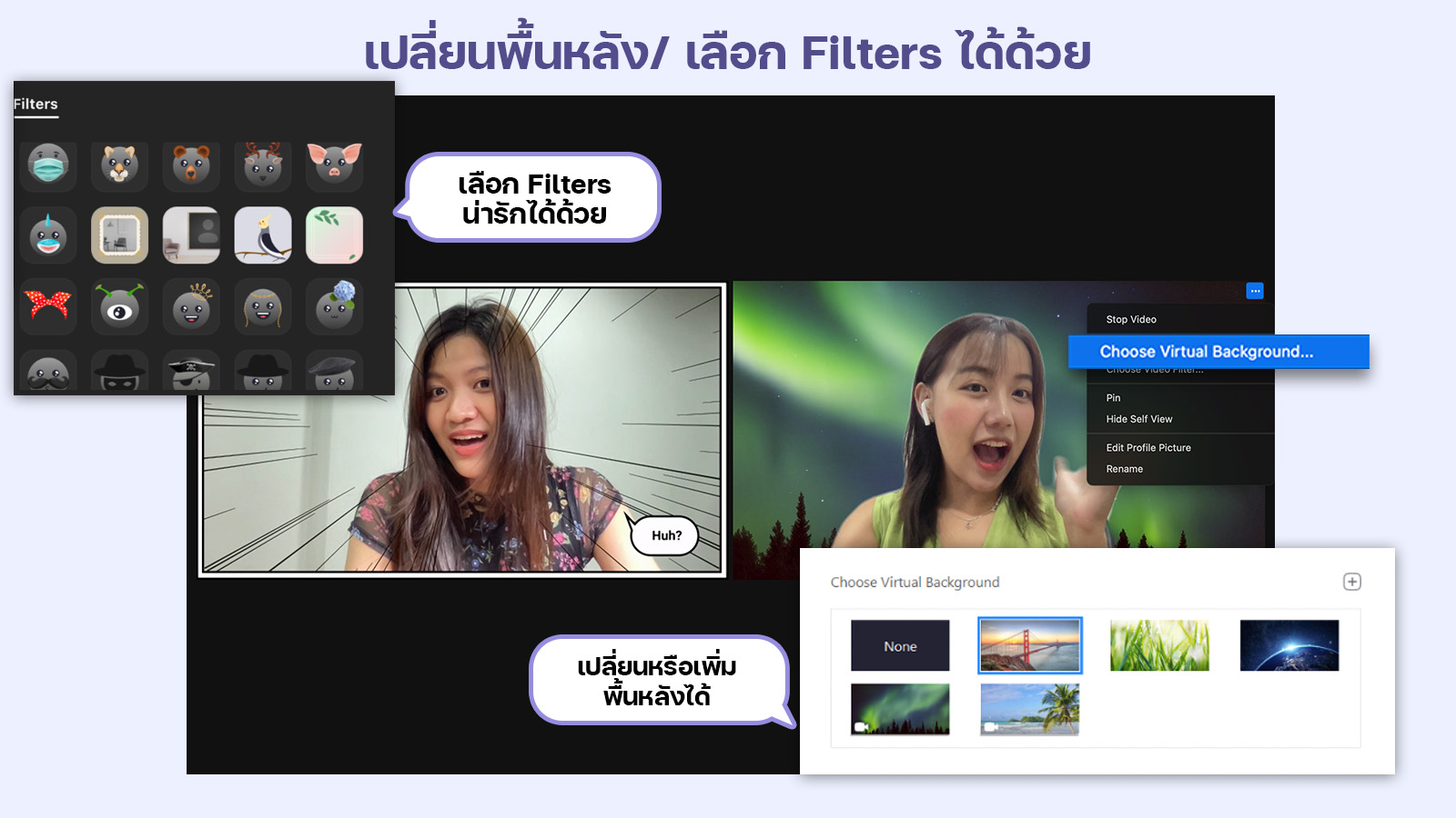 หรือเวลาที่เราประชุมแล้วมีมุมที่ไม่พึงประสง เราก็สามารถเปลี่ยนภาพพื้นหลังขณะประชุมได้ด้วย จะเป็นภาพสถานที่ท่องเที่ยว หรือภาพอื่นๆ ก็สามาถเปลี่ยนได้ตามใจชอบเลย