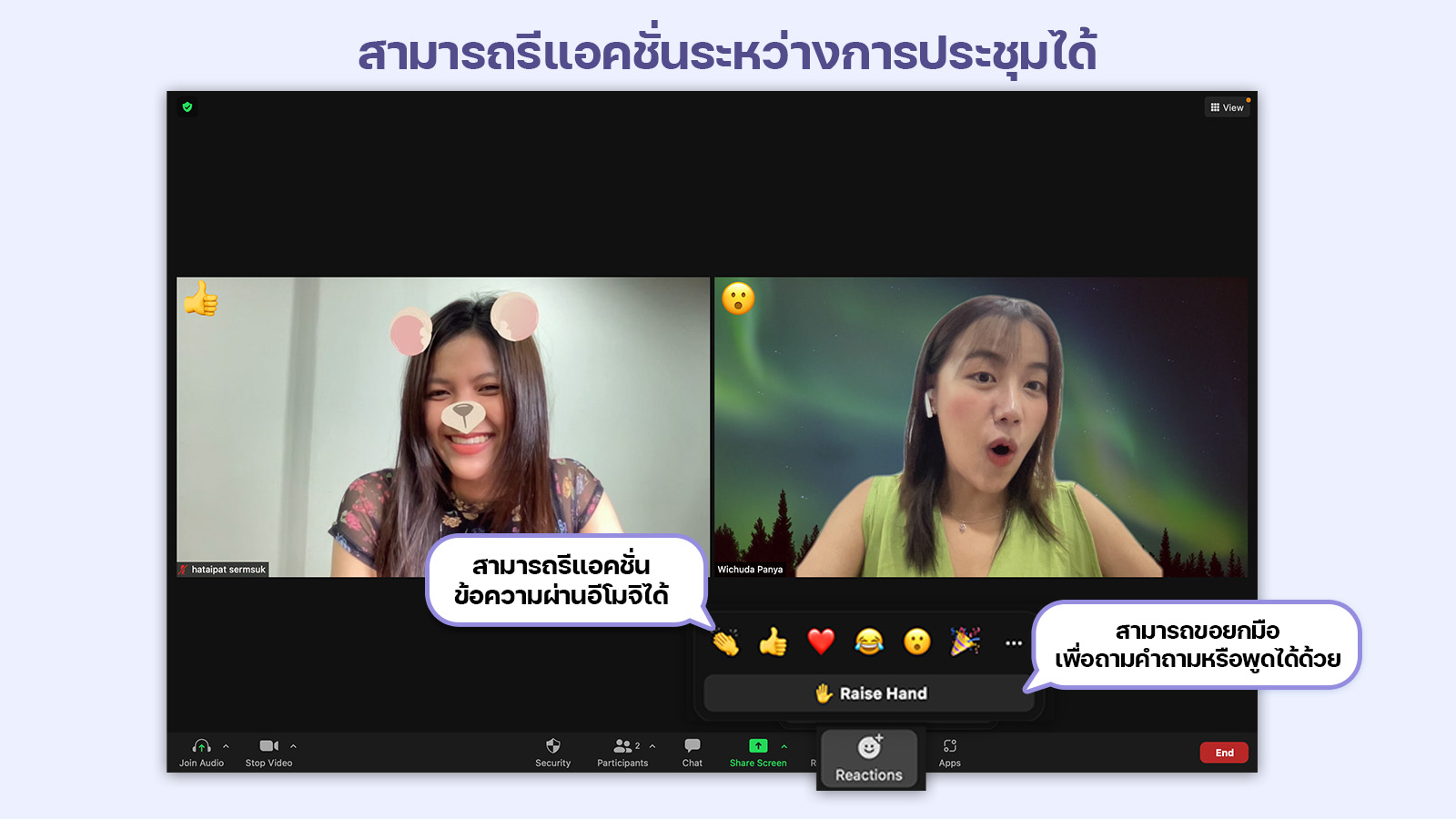 นอกจากนี้ยังมีปุ่มแสดงความรู้สึก เช่น การถูกใจ ปรบมือ หรือจะเป็นการยกมือในระหว่างการประชุมได้อีกด้วย