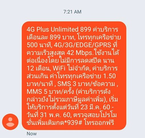 เล่นเน็ต 4G/3G/EDGE/GPRS ได้ไม่อั้นไม่ลดความเร็ว นาน 12 เดือน, ข้อความครั้งละ 3 บาท, MMS ครั้งละ 5 บาท, โทรเกินคิดนาทีละ 1.5 บาท