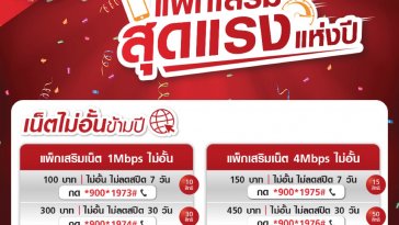 - ความเร็ว 1Mbps ใช้เน็ตไม่อั้น 30 วัน ราคา 321 บาท(รวมภาษี) กดสมัคร *900*1974# โทรออก