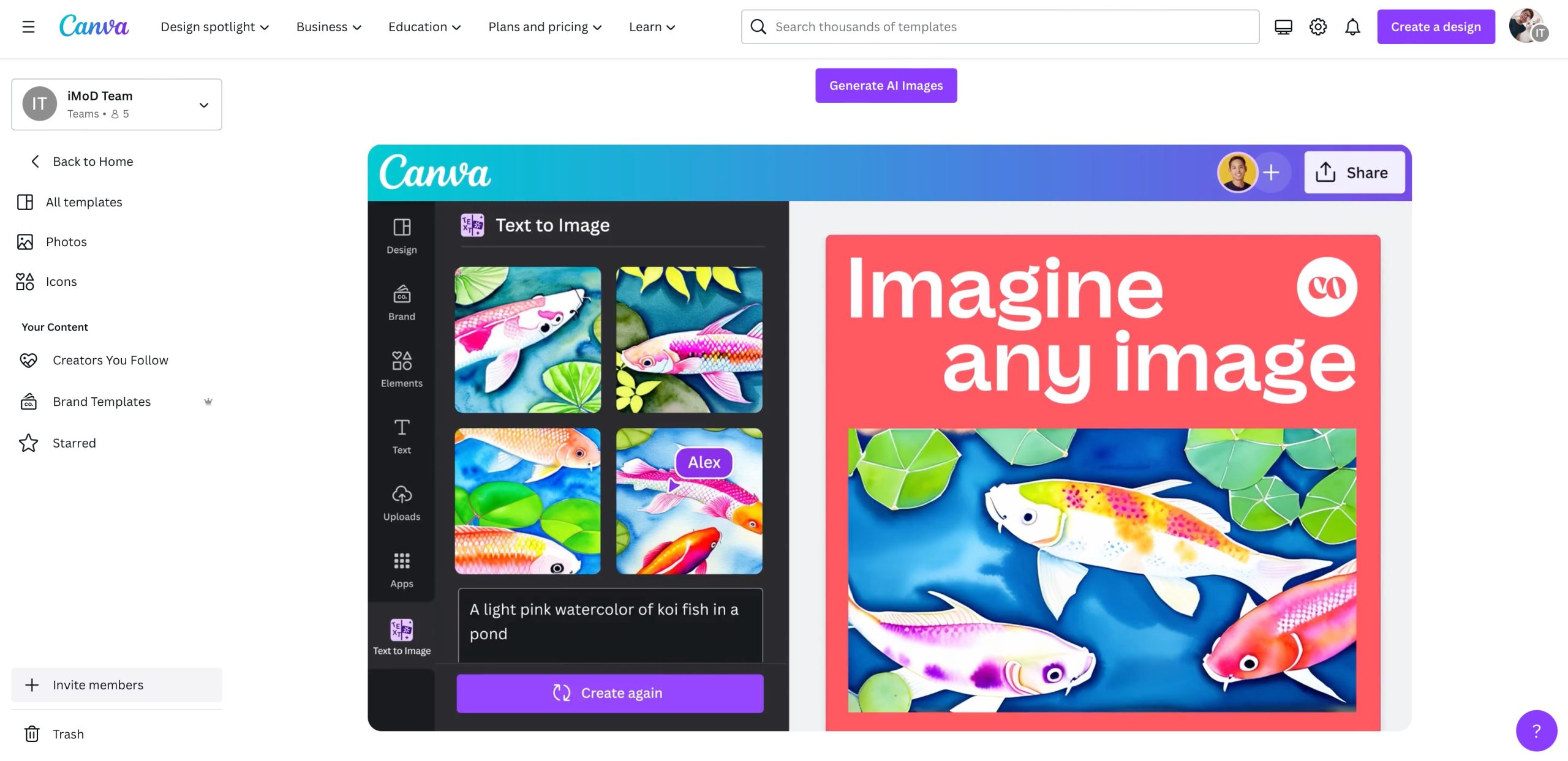 สามารถไปลองใช้งานกันได้ หากใครที่หาฟีเจอร์นี้ไม่เจอ ให้เข้าไปที่หน้าหลักของ Canva และเลื่อนลงมาที่หมวดของ AI ฟีเจอร์นี้จะชื่อว่า Text to image