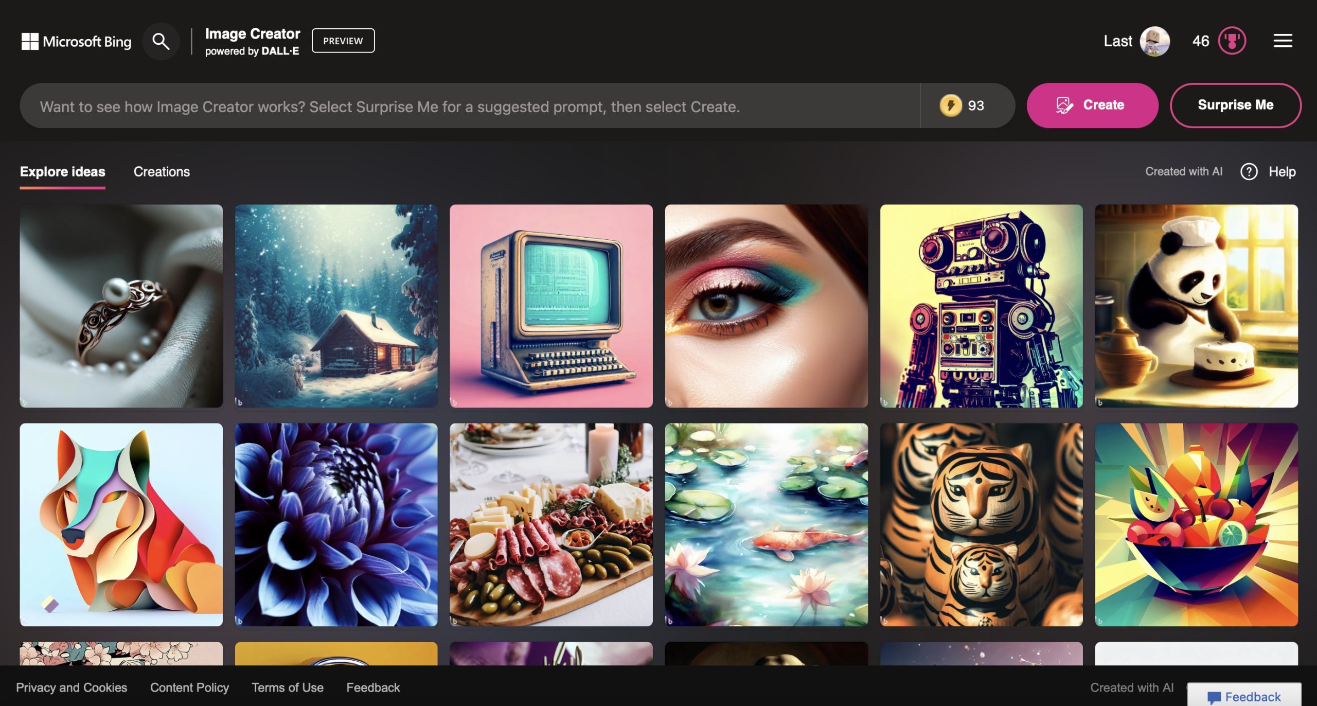 หน้าตาของเว็บไซต์เข้าใจง่าย มีหน้าต่างการค้นหาไอเดียให้เราได้ลองดูคำสั่งของคนอื่น ๆ รวมถึงสามารถกดปุ่ม Surprise Me เพื่อให้ระบบคิดประโยคในการสร้างรูปให้เราได้ด้วย สำหรับใครที่คิดไอเดียสำหรับการสร้างรูปไม่ออก