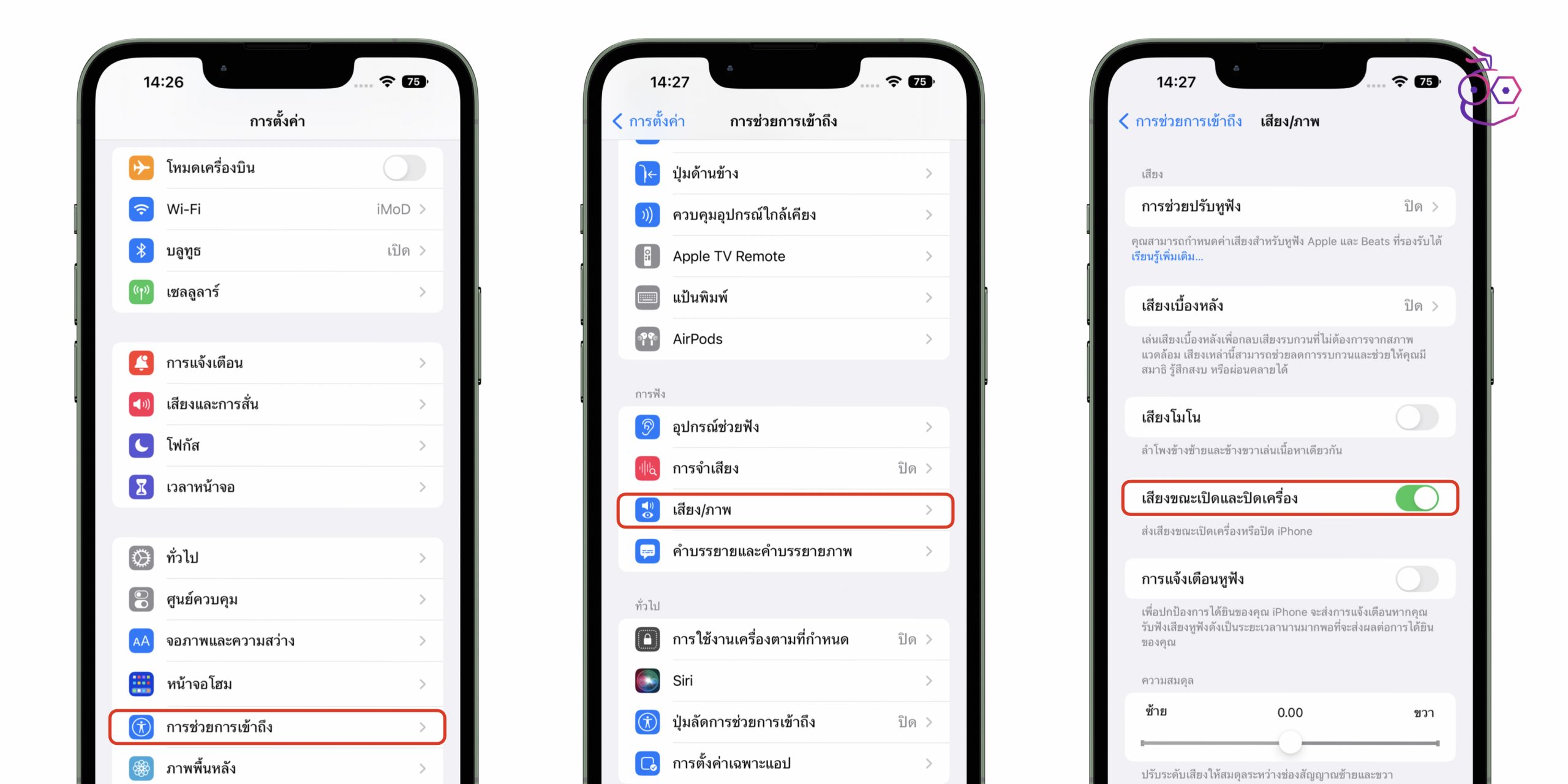 เราสามารถเปิด-ปิดฟีเจอร์นี้โดยเข้าไปที่ การตั้งค่า > การช่วยการเข้าถึง > เสียงและภาพ > เสียงขณะเปิดและปิดเครื่อง