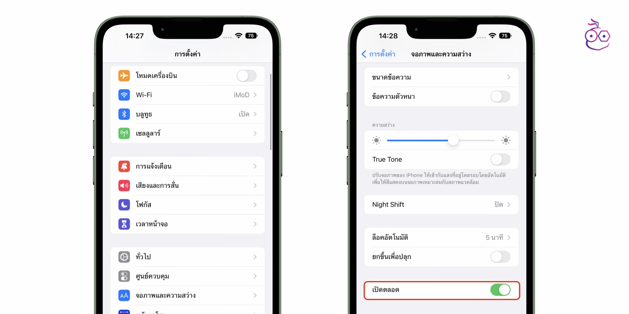 การตั้งค่า > จอภาพและความสว่าง > เปิดตลอด