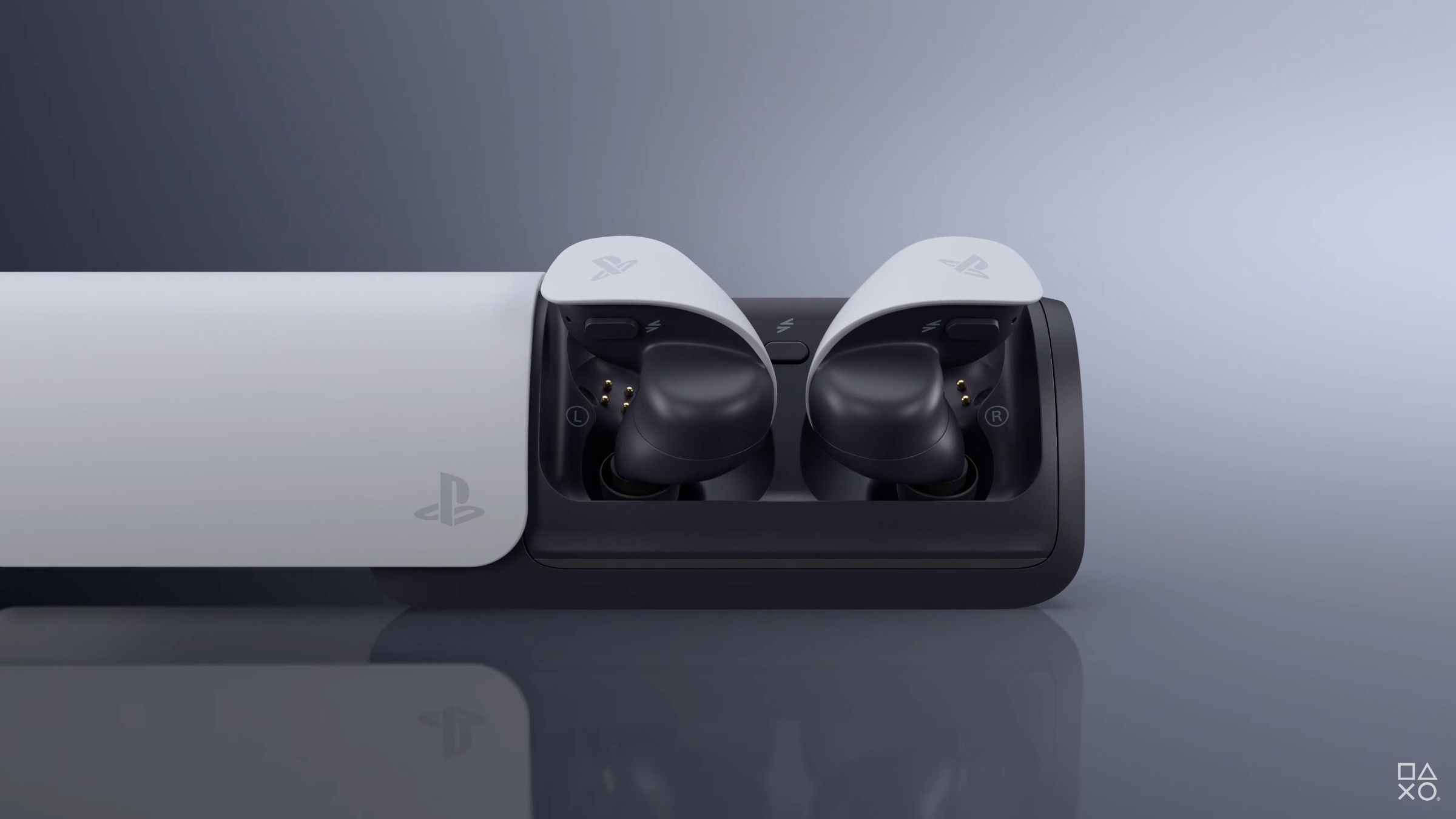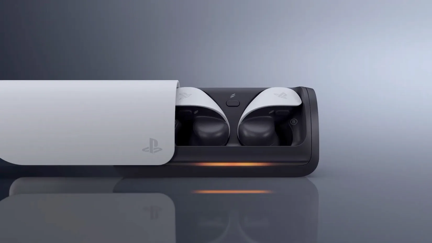 รวมถึงตัวเคสชาร์จแบบแนวนอน ใช้การสไลด์เพื่อปิด-เปิดฝา มีกิมมิคแสงไฟเดียวกันกับจอย Dual Sense Controller และเมื่อสังเกตุดี ๆ แล้วตัวเคสชาร์จนั้นจะมีลักษณะเหมือนกับเราวางเครื่อง PS5 ในแนวนอน