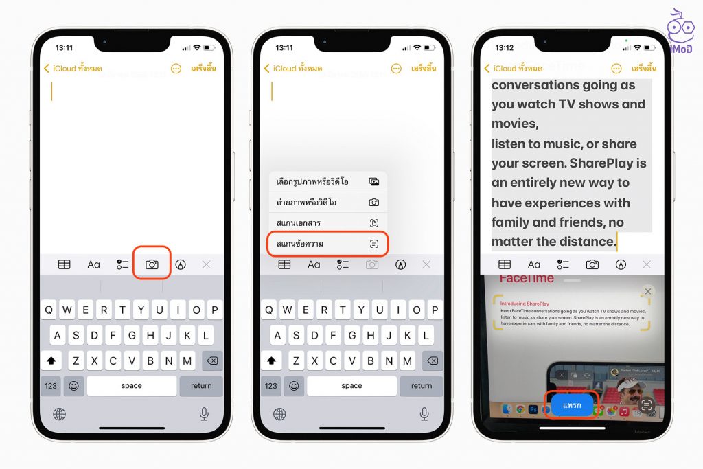สำหรับใครที่อยากจะให้มีการบันทึกข้อความในแอปโน้ต (Note) เลยก็สามารถใช้วิธีสแกนข้อความ (Live Text) ได้เลย [ชมวิธีอย่างละเอียดที่นี่] เราก็จะได้ข้อความที่เป็นตัวอักษรที่ตรวจจับได้จากภาพที่เรานำกล้อง iPhone ไปตรวจจับมา ไม่จำเป็นจะต้องพิมพ์เอง สะดวกมาก ๆ