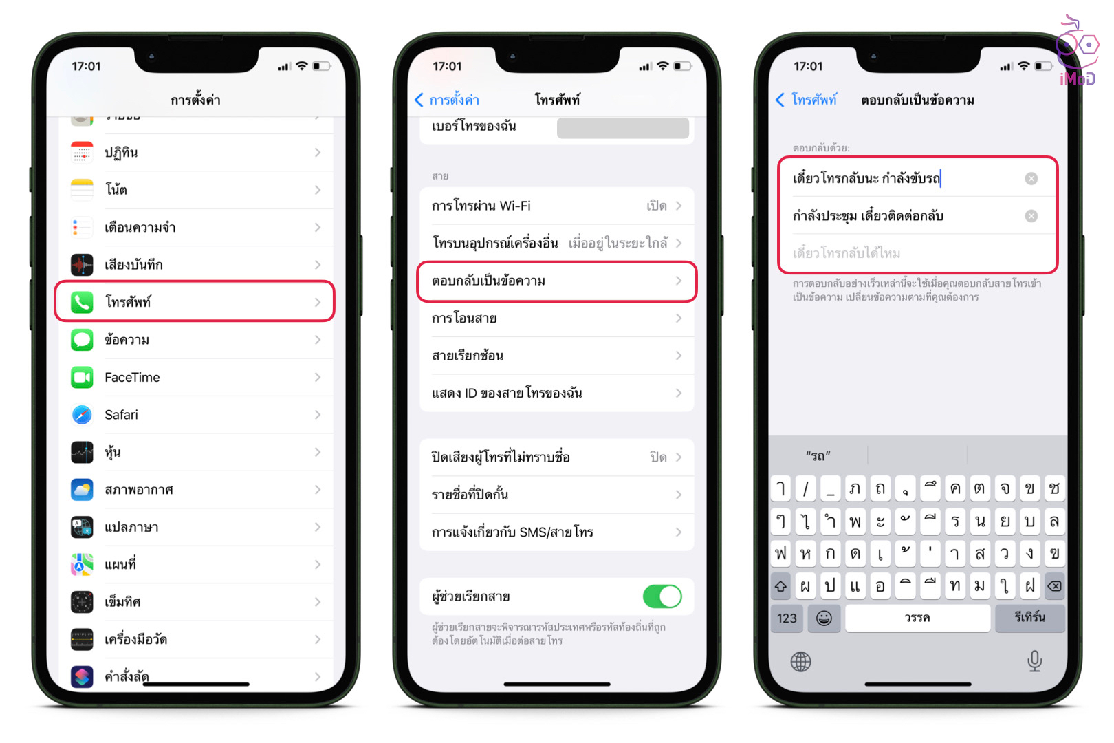 สามารถตั้งค่าได้ที่ การตั้งค่า (Settings) > โทรศัพท์ (Phone) > ตอบกลับข้อความ (Respond with Text) > ใส่ข้อความ 3 ข้อความที่เราต้องใช้บ่อยได้เลย