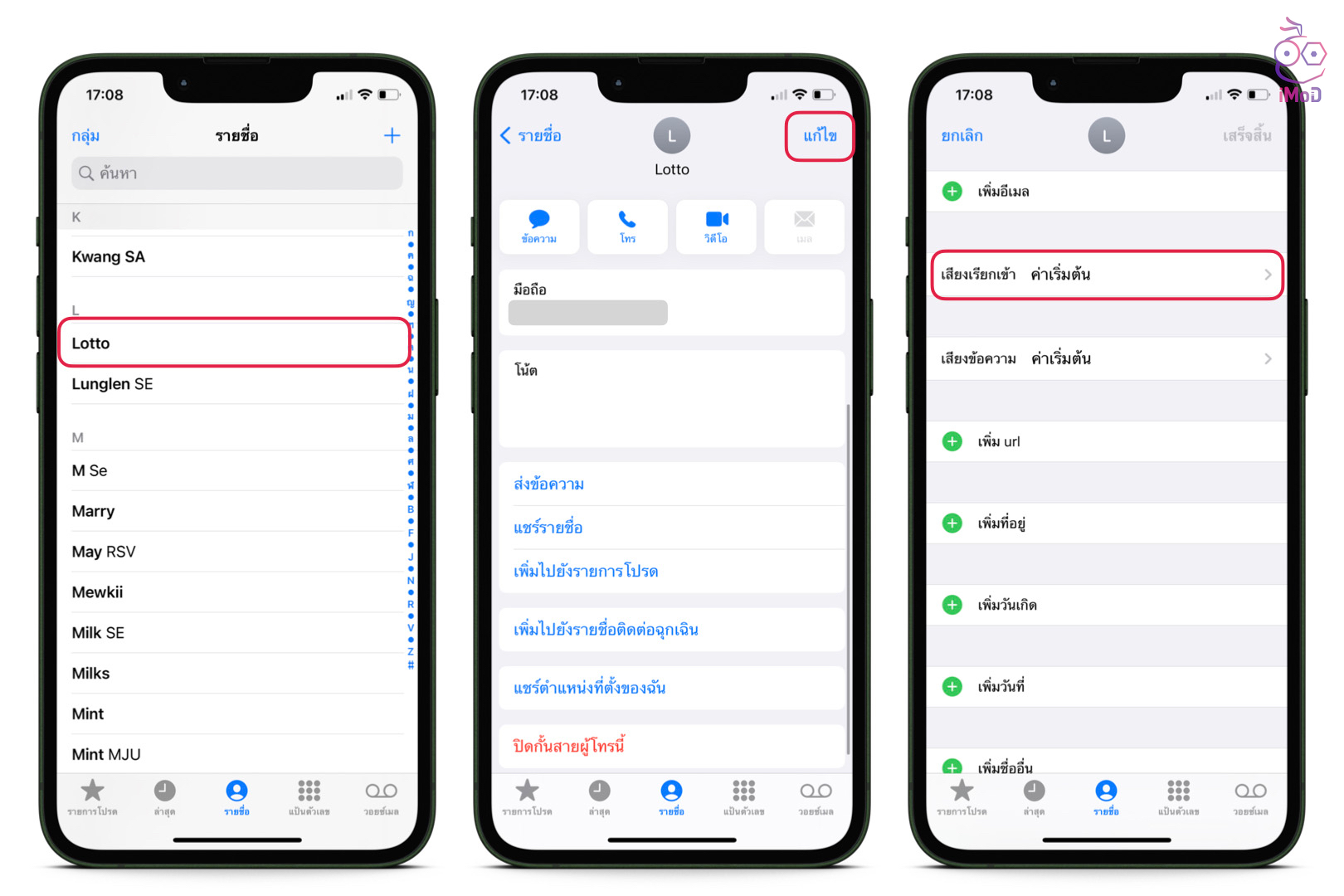 ถ้าหากเราไม่อยากจะรับสายที่เรารู้อยู่แล้วว่าเป็นเบอร์โทรที่น่ารำคาญ เราสามารถตั้งค่าเสียงเรียกเข้าเฉพาะสำหรับเบอร์เหล่านั้นได้ โดยไปตั้งค่าที่ แอปรายชื่อ (Contact) > เลือกรายชื่อที่ต้องการกำหนดเสียงเฉพาะ > แตะ แก้ไข (Edit) > เสียงเรียกเข้า (Ringtone)