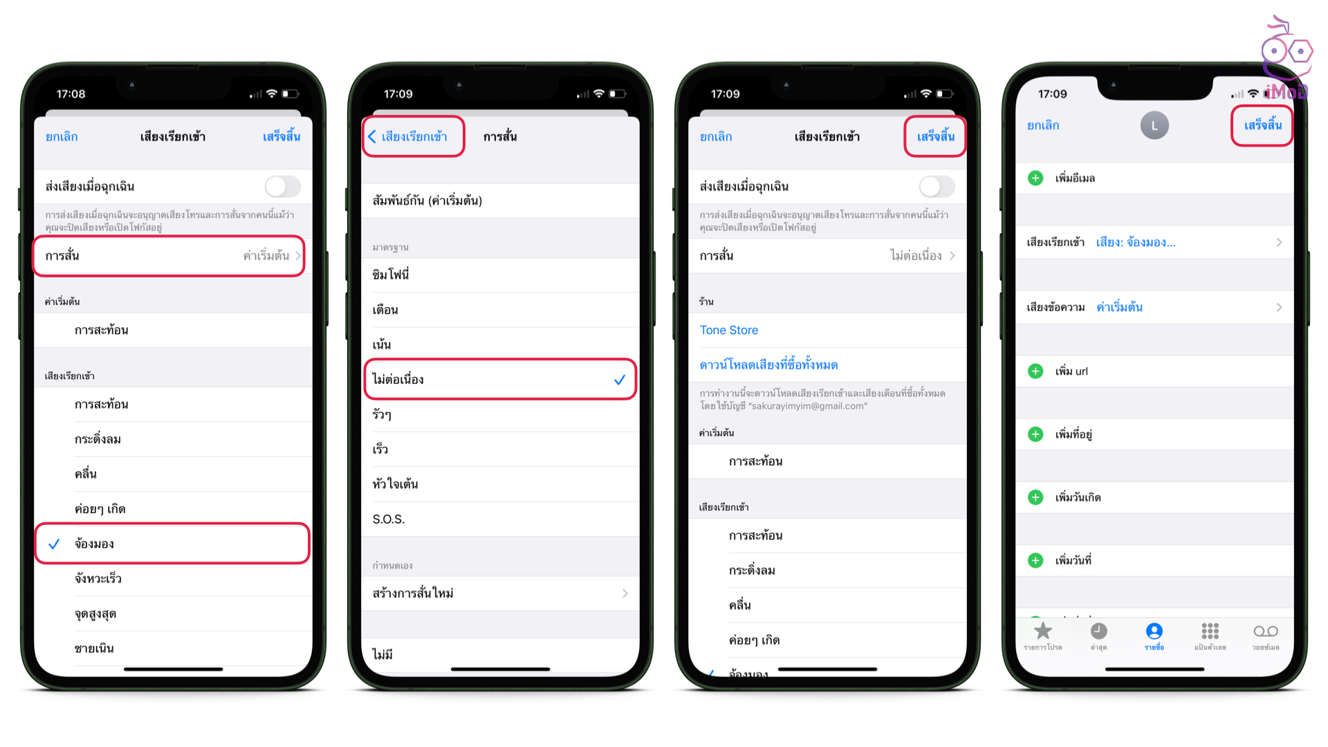 แล้วก็เลือกเสียงที่ต้องการ ในส่วนสายเรียกเข้า (Ringtone) ได้เลย นอกจากนี้ ในกรณีที่เราปิดเสียงโทรศัพท์อยู่ เราก็สามารถตั้งค่ารูปแบบการสั่น (Vibration) สำหรับสายโทรที่น่ารำคาญได้ด้วยเช่นกัน โดยแตะการสั่นด้านบน > เลือกรูปแบบการสั่น แล้วแตะกลับ จากนั้นก็แตะเสร็จสิ้น (Done)