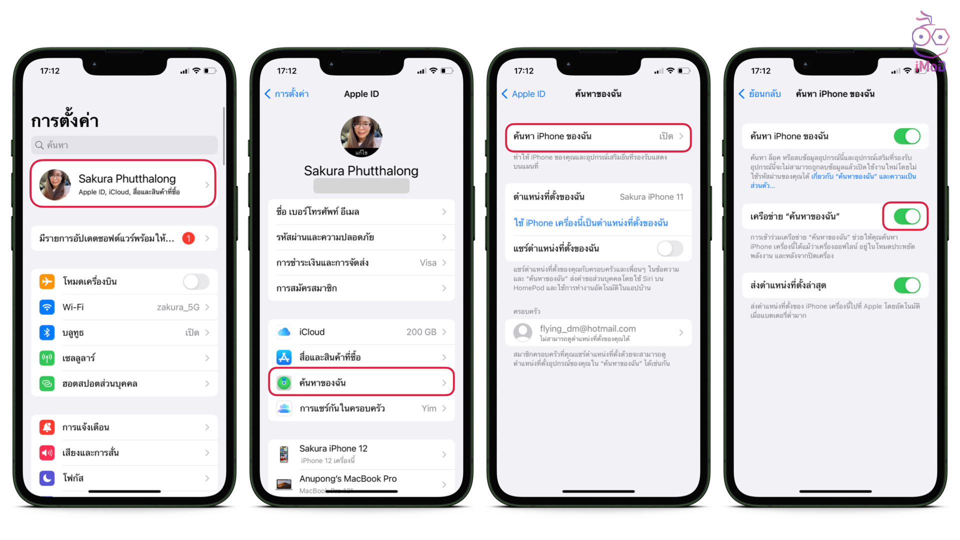 ไปที่ การตั้งค่า (Settings) > Apple ID > ค้นหาของฉัน (Find My) > ค้นหาของฉัน (Find My) > เปิด เครือข่าย ค้นหาของฉัน (Find My network)