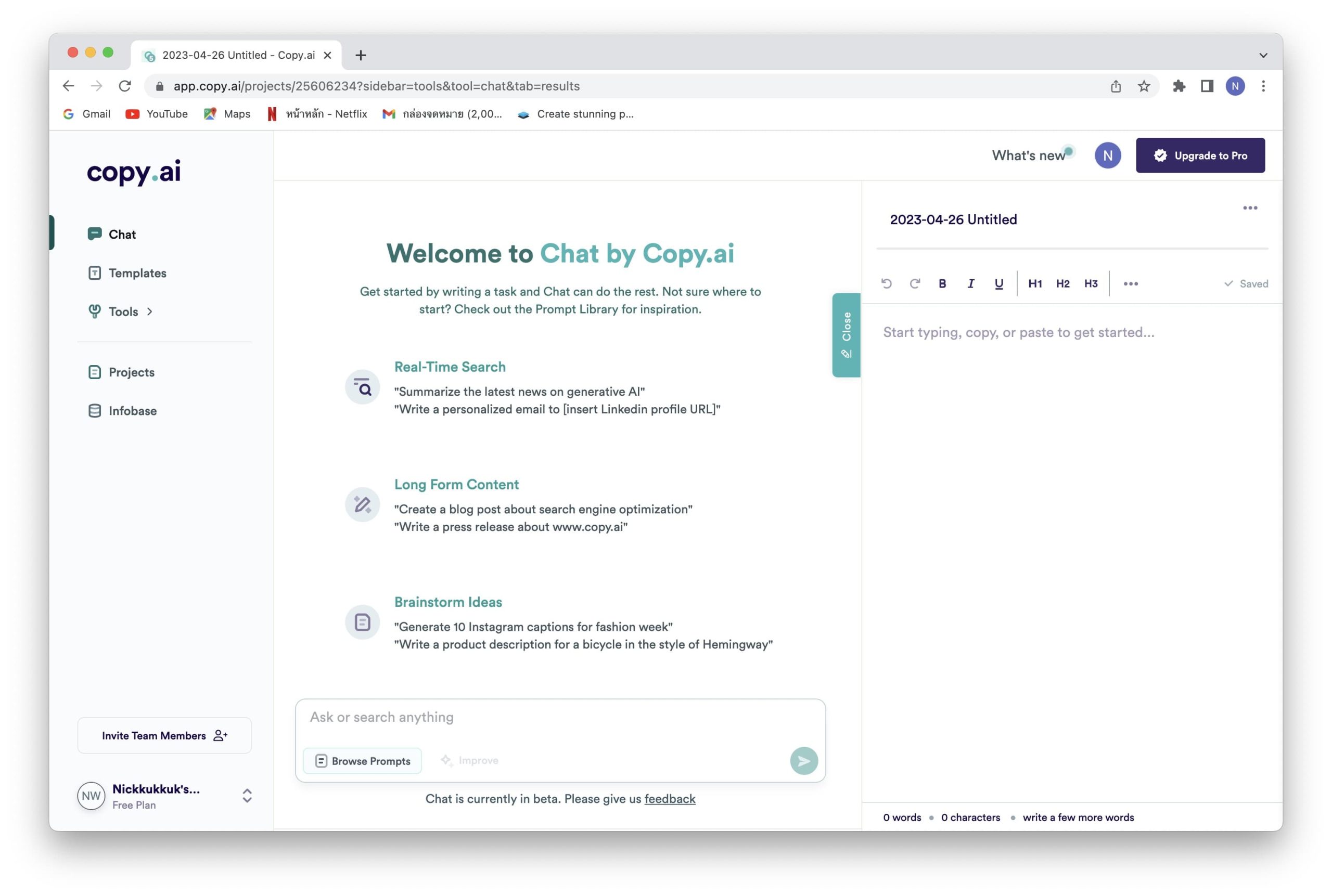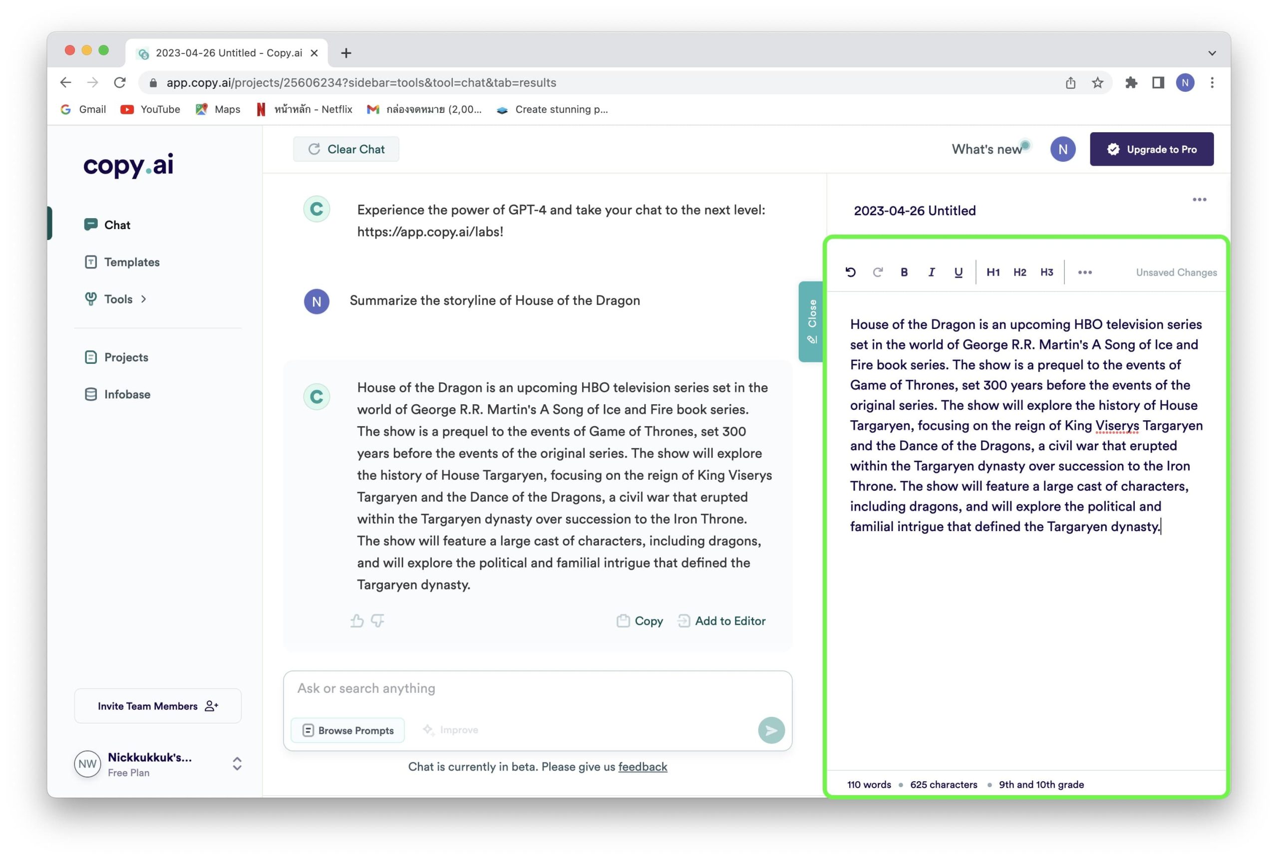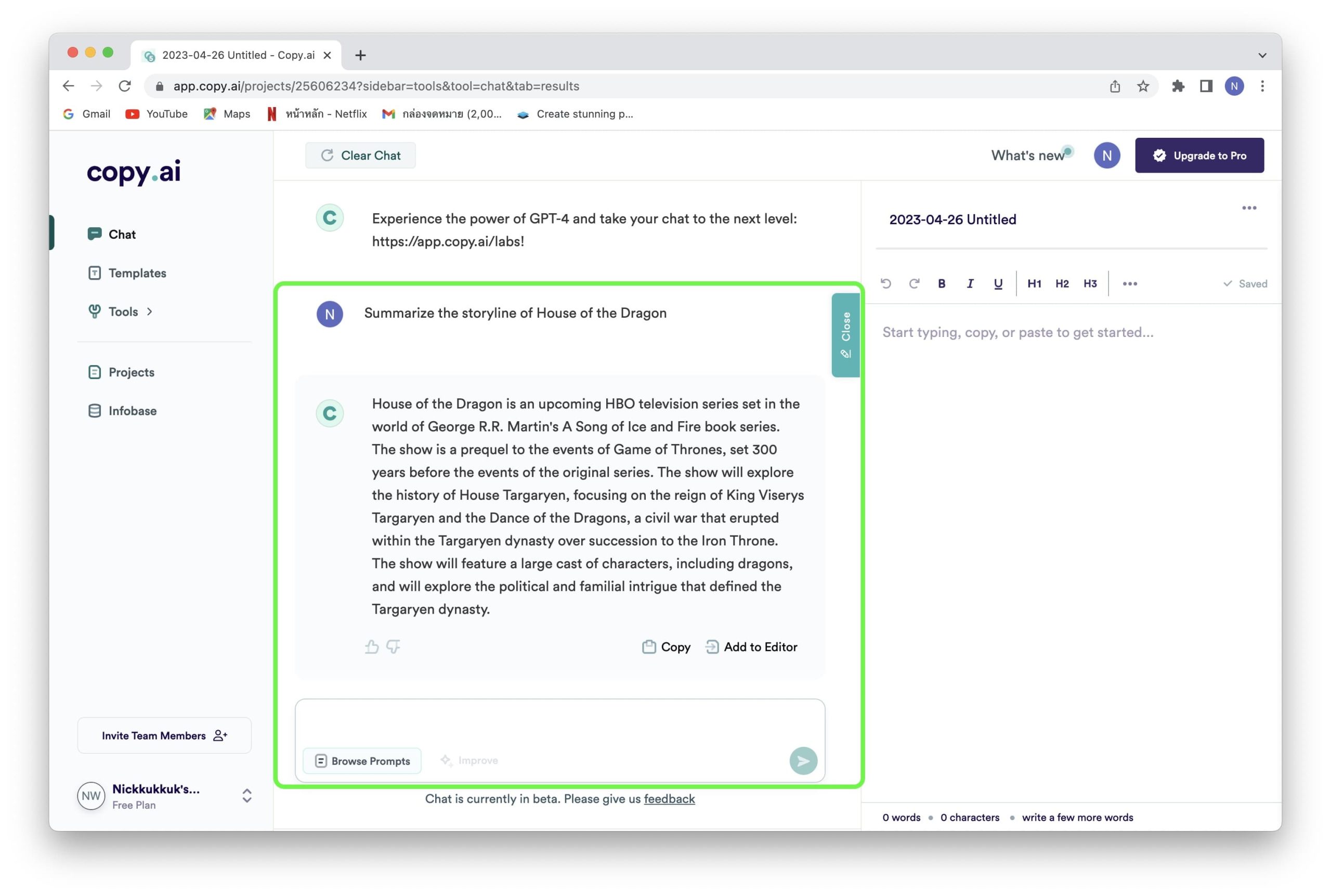 AI ตัวนี้คล้ายกับ ChatGPT เพราะเป็น AI แบบ text base เด่นเรื่องงานเขียน เช่น เขียนสรุป เขียนอีเมล เขียน blog เขียนแคปชัน เขียนคำบรรยายผลิตภัณฑ์ ทำได้หมดเลย