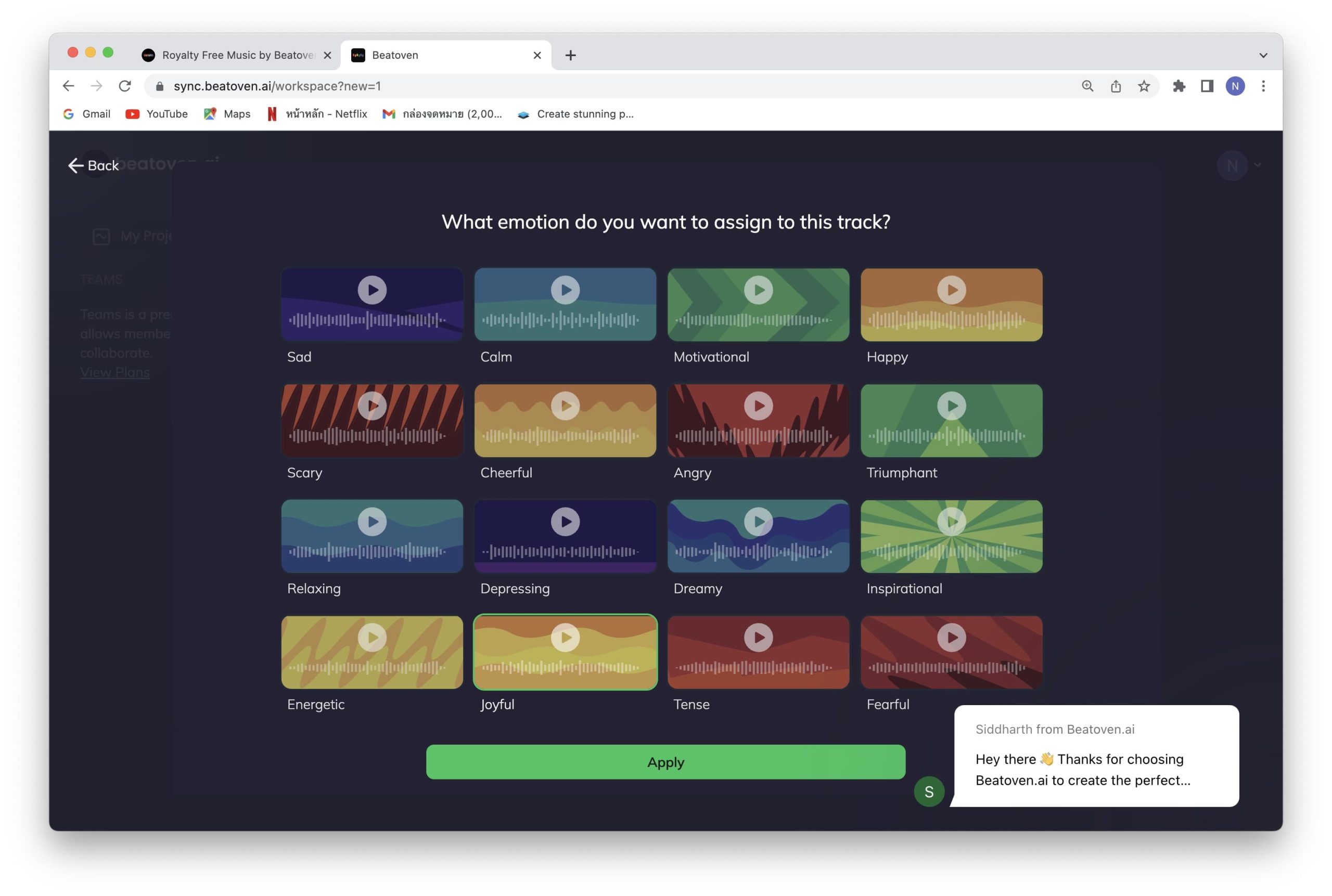 จากนั้นจะให้เราเลือกมู้ด หรืออารมของเพลง เลือกได้ว่าจะเอาแบบ สนุกสนาน ผ่อนคลาย สงบ มีพลัง และอื่น ๆ