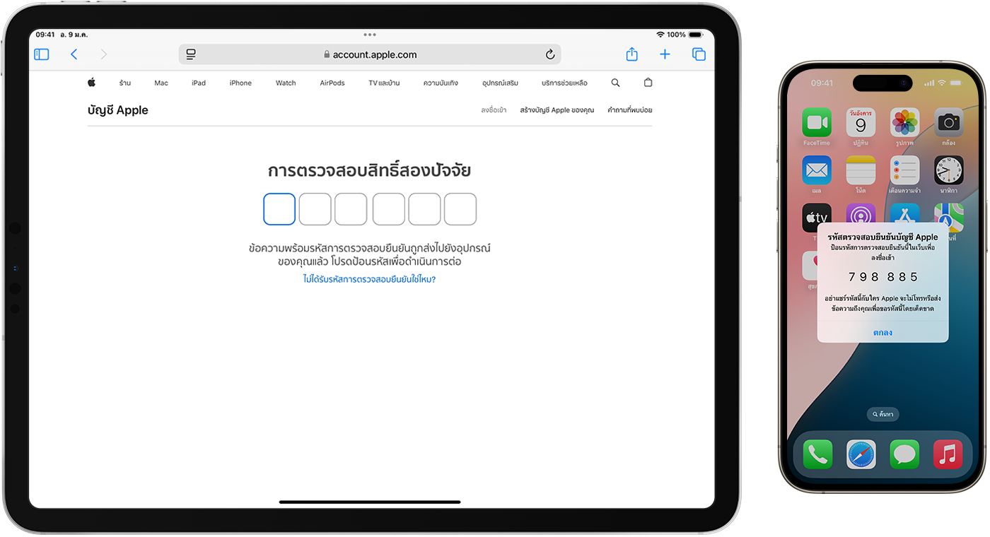 เข้าไปที่ การตั้งค่า > [ชื่อของคุณ] > ลงชื่อเข้าและความปลอดภัย แตะเปิดใช้ “การตรวจสอบสิทธิ์สองปัจจัย” จากนั้น แตะ “ดำเนินการต่อ” และทำตามคำแนะนำบนหน้าจอ
