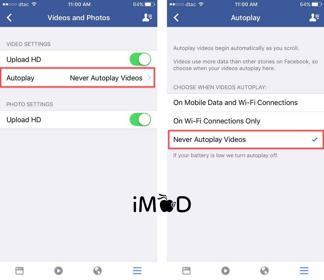 แอป Facebook เวอร์ชันใหม่ๆ มาพร้อมกับคุณสมบัติการเล่นวิดีโออัตโนมัติหากเราใช้นิ้วเลื่อนผ่านโพสต์วิดีโอ หรือการถ่ายทอดสดวิดีโออยู่ ข้อดีคือเราสามารถดูตัวอย่างวิดีโอที่เล่นอยู่ได้ แต่ข้อเสียคือเราจะเสียปริมาณอินเทอร์เน็ต (3G/4G) และแบตเตอรี่โดยเปล่าประโยชน์กับวิดีโอที่เราไม่ได้สนใจ ซึ่งเราสามารถปิดฟังก์ชันนี้ได้โดย