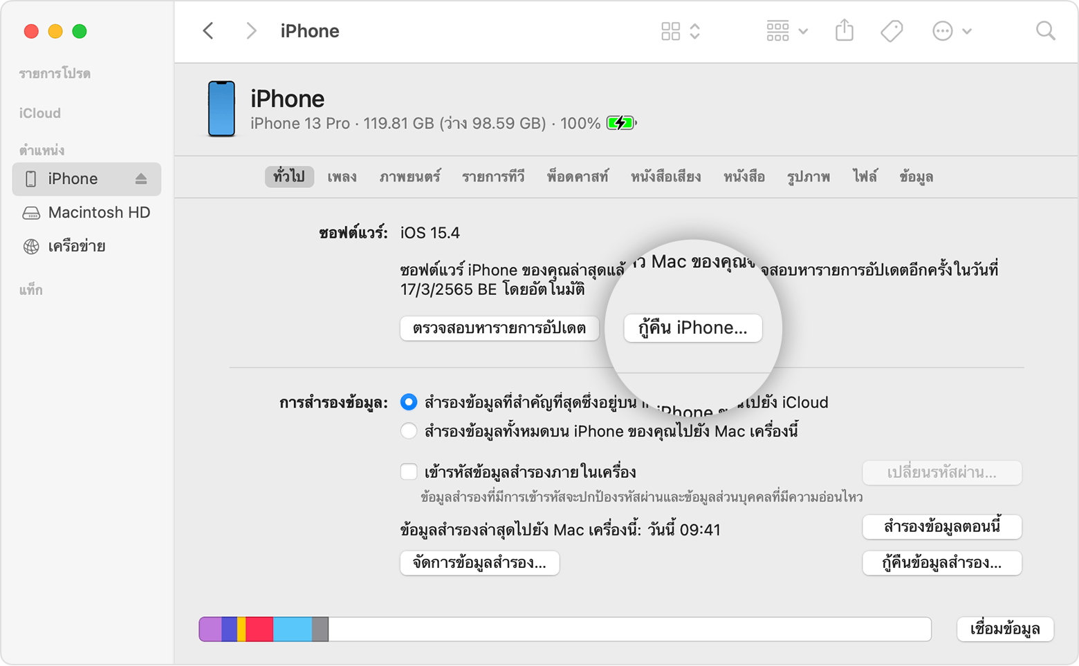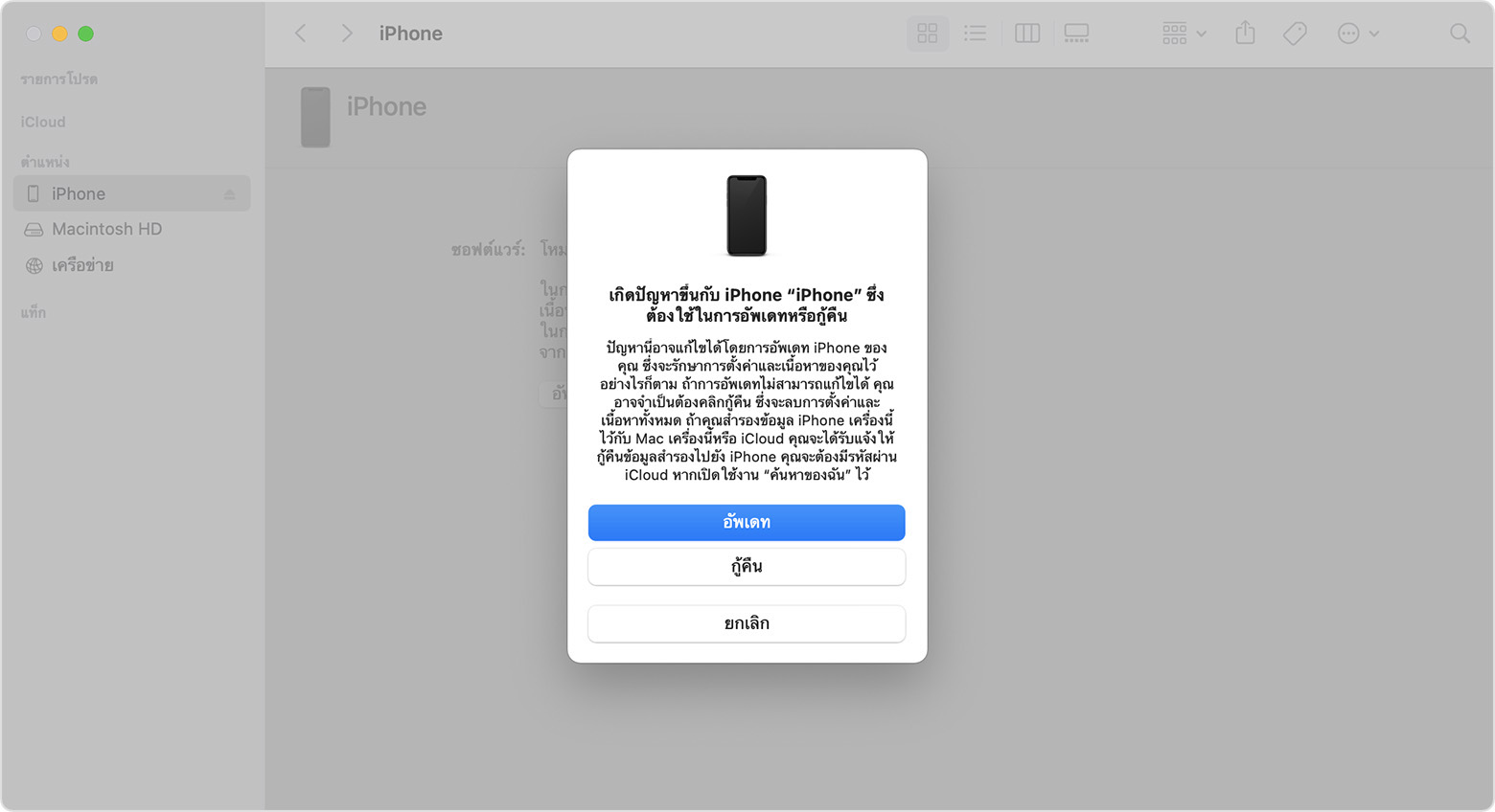 เชื่อมต่อ iPhone กับคอมพิวเตอร์ เปิด Finder หรือ iTunes > เลือก กู้คืน iPhone (Restore iPhone)