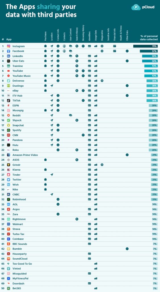 จากผลการจัดอันดับเห็นได้ว่าแอปที่ได้รับความนิยมอย่าง eBay, TikTok, Reddit, Snapchat และ Spotify ก็ติดอยู่ใน 20 อันดับ ซึ่งเข้าถึงข้อมูลผู้ใช้ประมาณ 29%