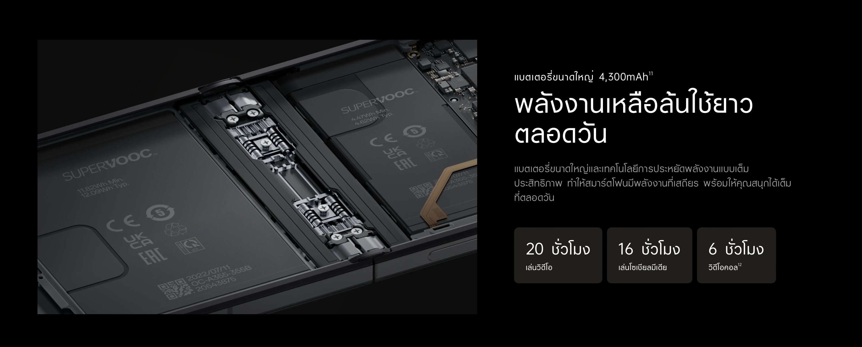 อีกหนึ่งไฮไลท์ที่น่าสนใจคือ คามจุแบตเตอรี่ที่เยอะมาก ขนาดความจุกว่า 4,300 mAh (Samsung Galaxy Z Flip 4 : 3,700 mAh) ซึ่งมาพร้อมกับระบบชาร์จไว 44W SUPERVOOC ชาร์ตแบต 23 นาทีได้แบตเตอรี่ 50%