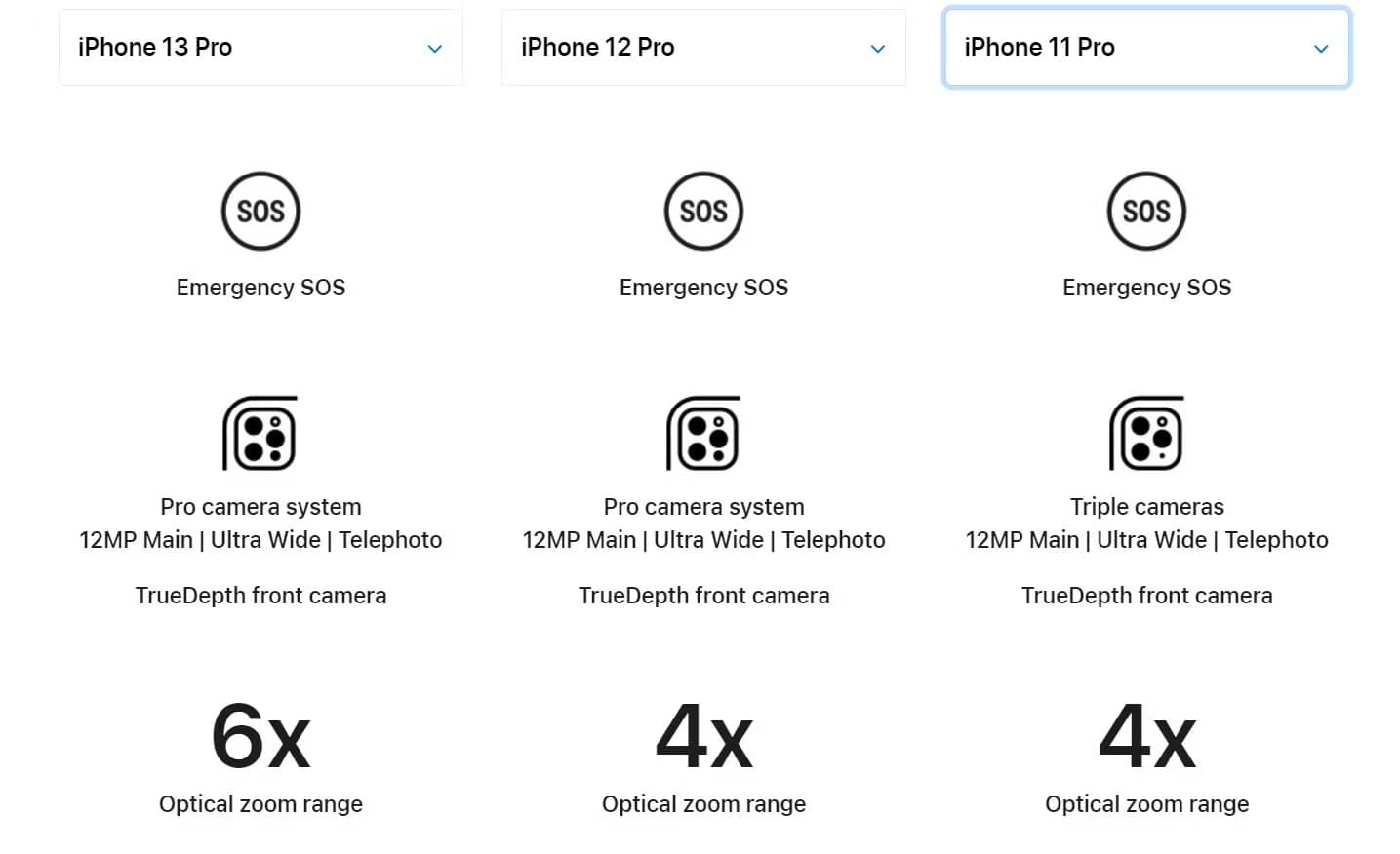 ลองเปรียบเทียบ iPhone 12 Pro, 13 Pro และ 14 Pro นอกจากขนาดและสีของกล้องแล้ว ก็ดูว่าแทบจะไม่มีอะไรที่ดูแตกต่างกันมาก ทั้งเรื่อง Face ID, หน่วยความจำ, ความจุแบตเตอรี่, การกันน้ำ และการเชื่อมต่อ