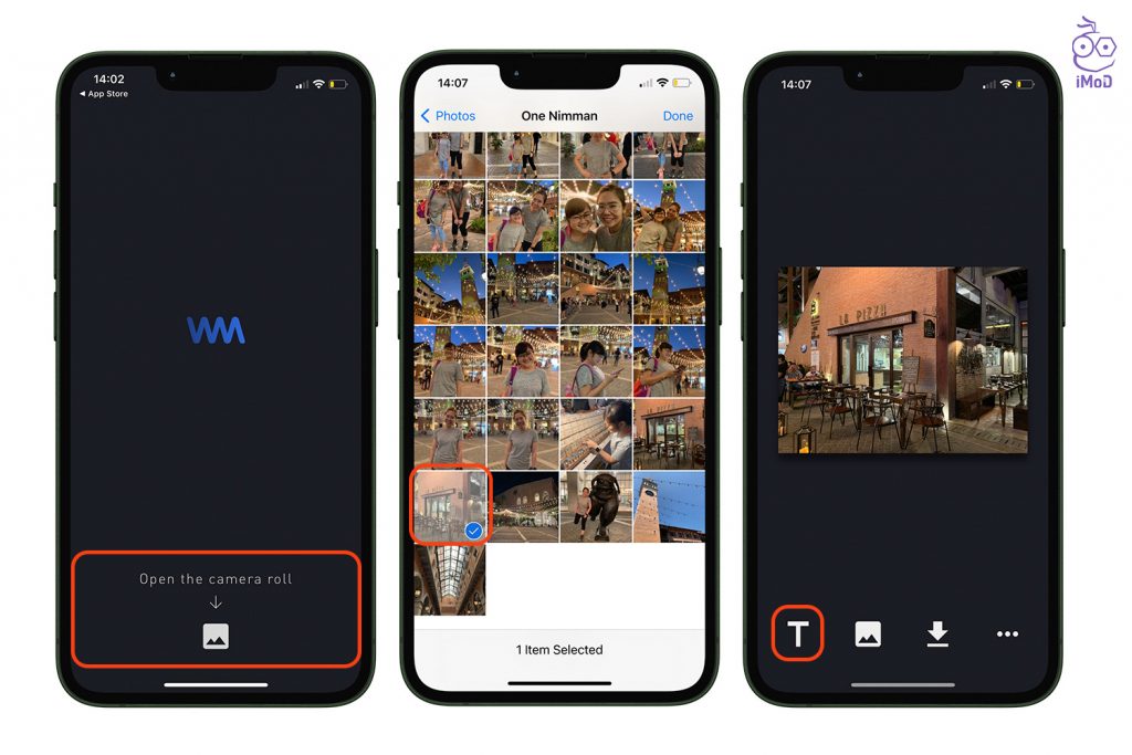 ไปที่แอป WaterMark > แตะ Open the camera roll > เลือกรูปภาพ (เลือกหนึ่งรูปหรือหลายรูปก็ได้) > เลือกไอคอนตัวอักษร T