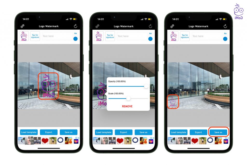 แตะที่รูปภาพลายน้ำแล้วลากไปยังตำแหน่งที่ต้องการจัดวาง และแตะที่รูปลายน้ำแล้วตั้งค่าความโปร่งใส รวมถึงขนาดรูปภาพ เมื่อปรับแต่งเรียบร้อยแล้วก็แตะ Save as เพื่อบันทึกรูปภาพได้เลย