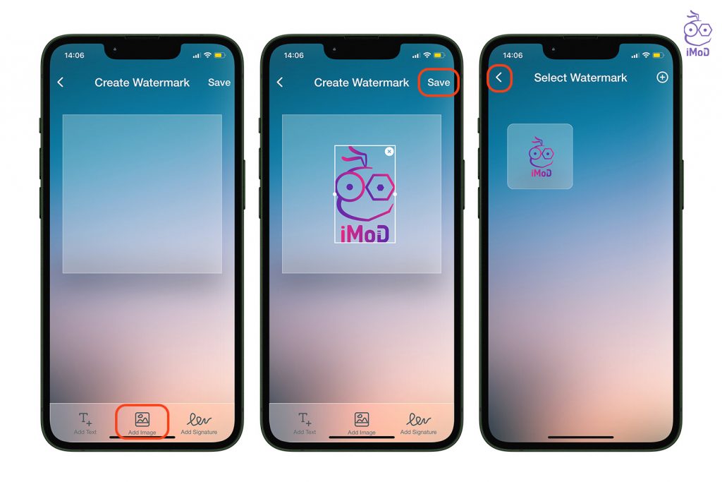แตะ Add Image ด้านล่าง แล้วเลือกรูปภาพลายน้ำที่เราบันทึกไว้ในเครื่อง > แตะ Save > เราก็จะได้โลโก้หรือรูปลายน้ำไว้ใช้ภายในแอป > หากต้องการใส่ลายน้ำ ให้แตะไอคอนกลับ ด้านบน