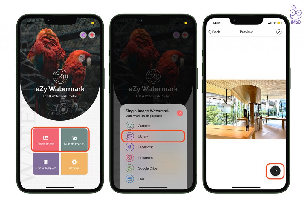 ไปที่แอป eZy Watermark > แตะ Library เพื่อเลือกรูปภาพ แล้วเลือกรูปภาพที่ต้องการ > แตะไอคอนถัดไป
