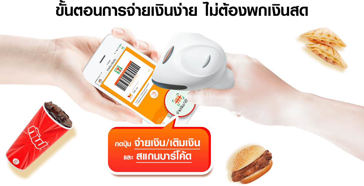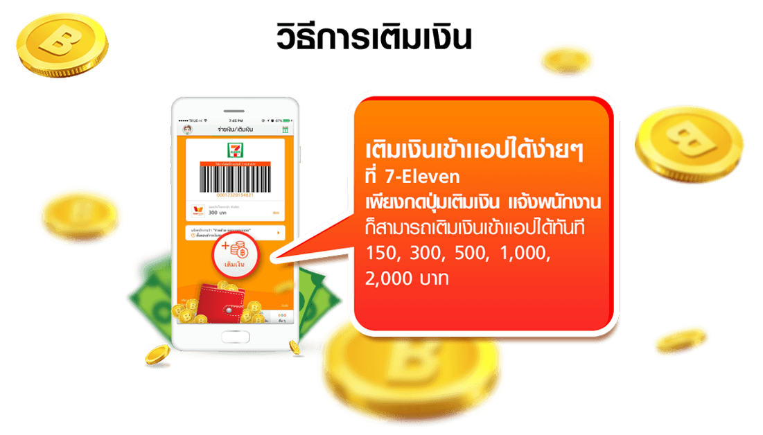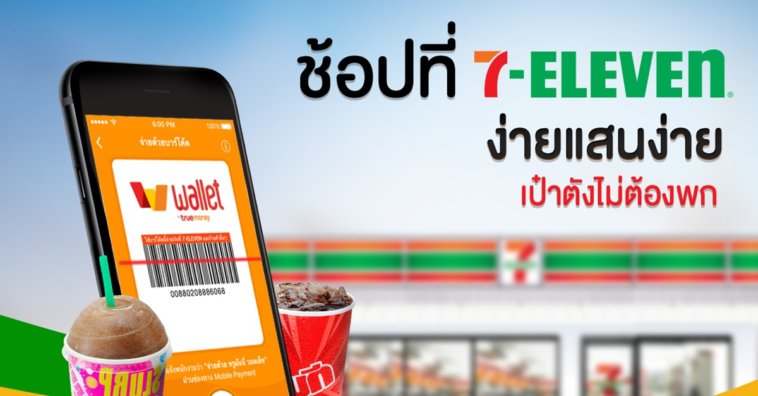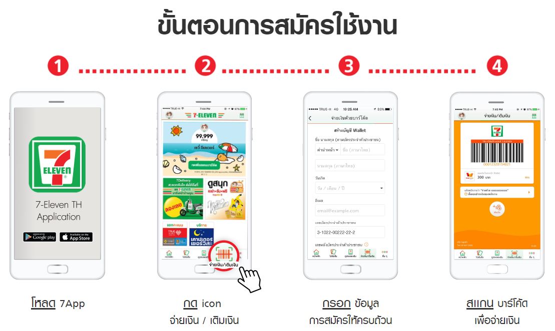 ถึงแม้ว่าจะชื่อ Wallet by truemoney (TrueMoney Wallet) แต่ก็สามารถใช้งานได้ทุกเครือข่าย ไม่จำเป็นต้องมีเบอร์ทรูแต่อย่างใด ขั้นแรกคือดาวน์โหลดแอปพลิเคชัน 7-Eleven TH มาไว้บนเครื่อง จากนั้นเลือกเมนูที่สาม (ดังภาพ) “จ่ายเงิน/เติมเงิน” ที่เป็นสัญลักษณ์บาร์โค้ด