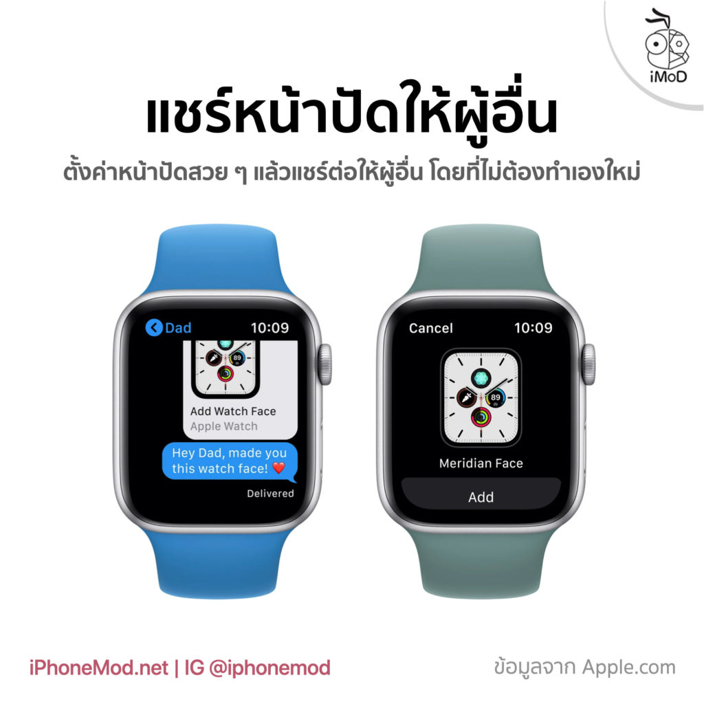 ใน watchOS 7 ผู้ใช้สามารถแชร์หน้าปัด Apple Watch ให้กับเพื่อนหรือผู้อื่นได้ง่าย ๆ เวลาที่เราตั้งค่ากลไกลหน้าปัดไว้ แล้วมีคนอื่นอยากได้เหมือนกัน ก็สามารถแชร์ต่อไปทั้งกลไกได้เลย โดยผู้อื่นไม่ต้องไปตั้งค่าเอง