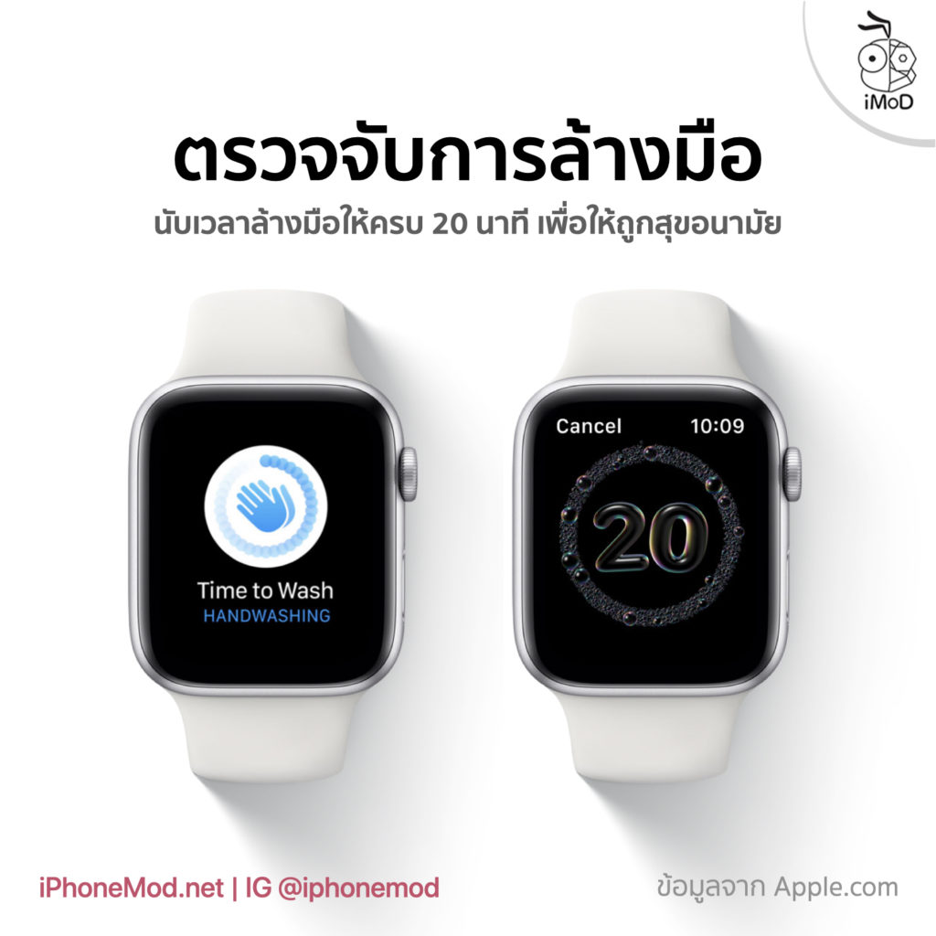 ฟีเจอร์การล้างมือ (Hand Washing) นั้นจะใช้วิธีตรวจจับการเคลื่อนไหวบนข้อมือและฟังเสียงน้ำไหลหรือฟองสบู่ เมื่อตรวจจับการล้างมือได้แล้ว Apple Watch ก็จะแจ้งเตือนให้เราล้างมือเป็นเวลา 20 วินาที เพื่อให้ผู้ใช้ได้ล้างมืออย่างถูกสุขลักษณะ