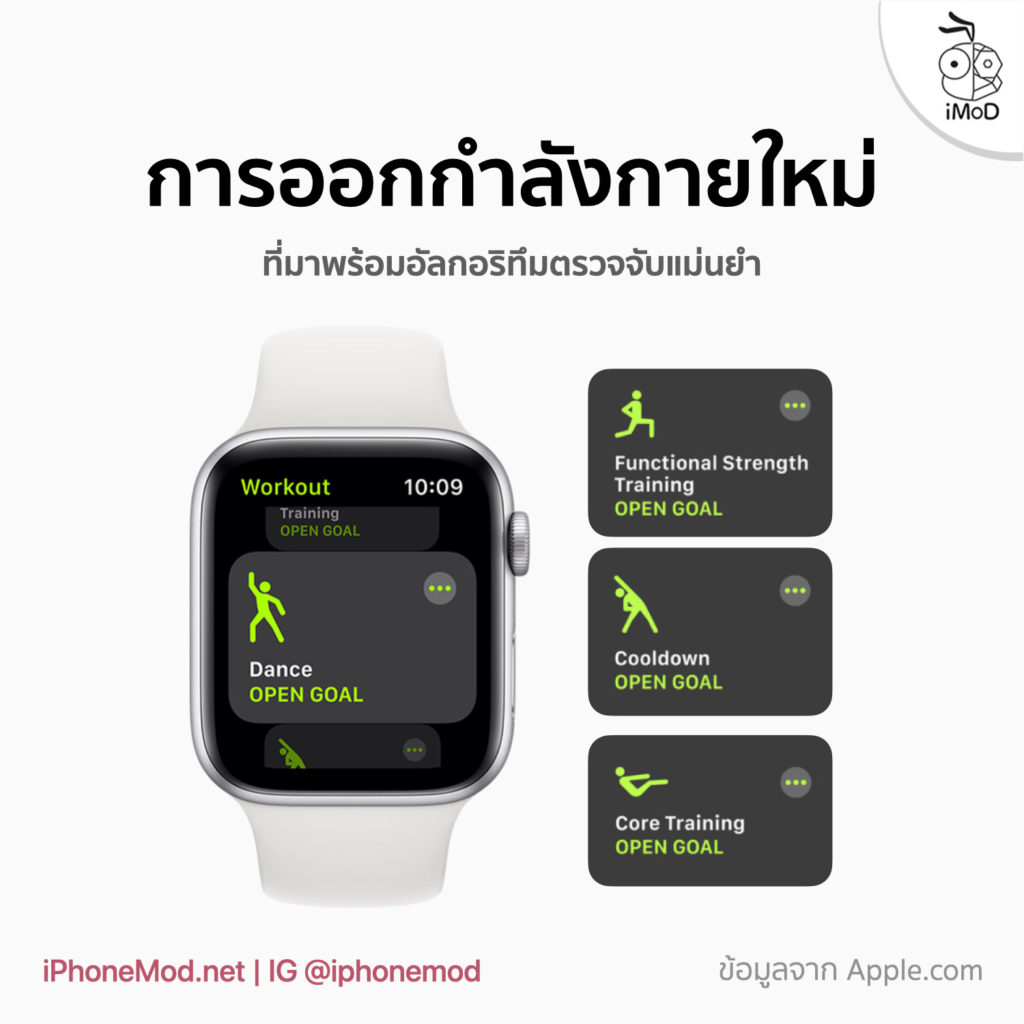 watchOS 7 มาพร้อมประเภทการออกกำลังกายใหม่ 4 ประเภท ได้แก่ การเต้น (Dance), ออกกำลังกายเพื่อปรับโครงสร้าง (Functional Strength Training), การคูลดาวน์ (Cooldown) และการออกกำลังกายแกนกลางลำตัว (Core Training) ซึ่งมีการปรับอัลกอริทึมให้เหมาะสมกับการเคลื่อนไหวของร่างกายแต่ละประเภท