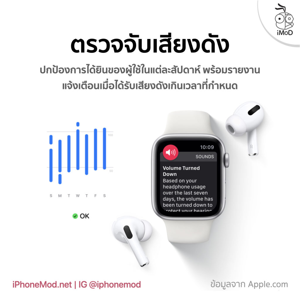 ปกป้องหูของผู้ใช้มากขึ้นด้วยคุณสมบัติด้านสุขภาพที่ควบคุมปริมาณการฟังของผู้ใช้ตลอดสัปดาห์ให้ปลอดภัยจากเสียงดัง ซึ่งปกติแล้วคน ๆ หนึ่งสามารถรับฟังได้ที่ระดับเสียงดัง 80 เดซิเบลเป็นเวลา 40 ชั่วโมงต่อสัปดาห์ ถ้าหากเราได้รับเสียงเกินเวลานี้ Apple Watch จะแจ้งเตือนให้ทราบ เพื่อให้ผู้ใช้ลดระดับเสียงในช่วงวันที่เหลือภายในสัปดาห์นั้น