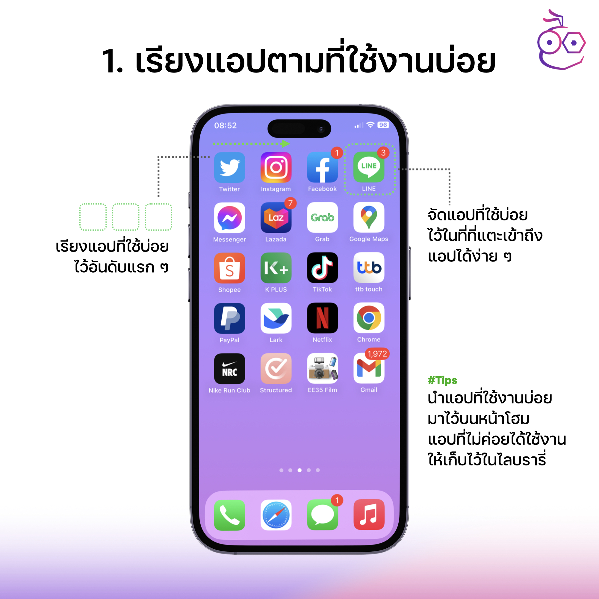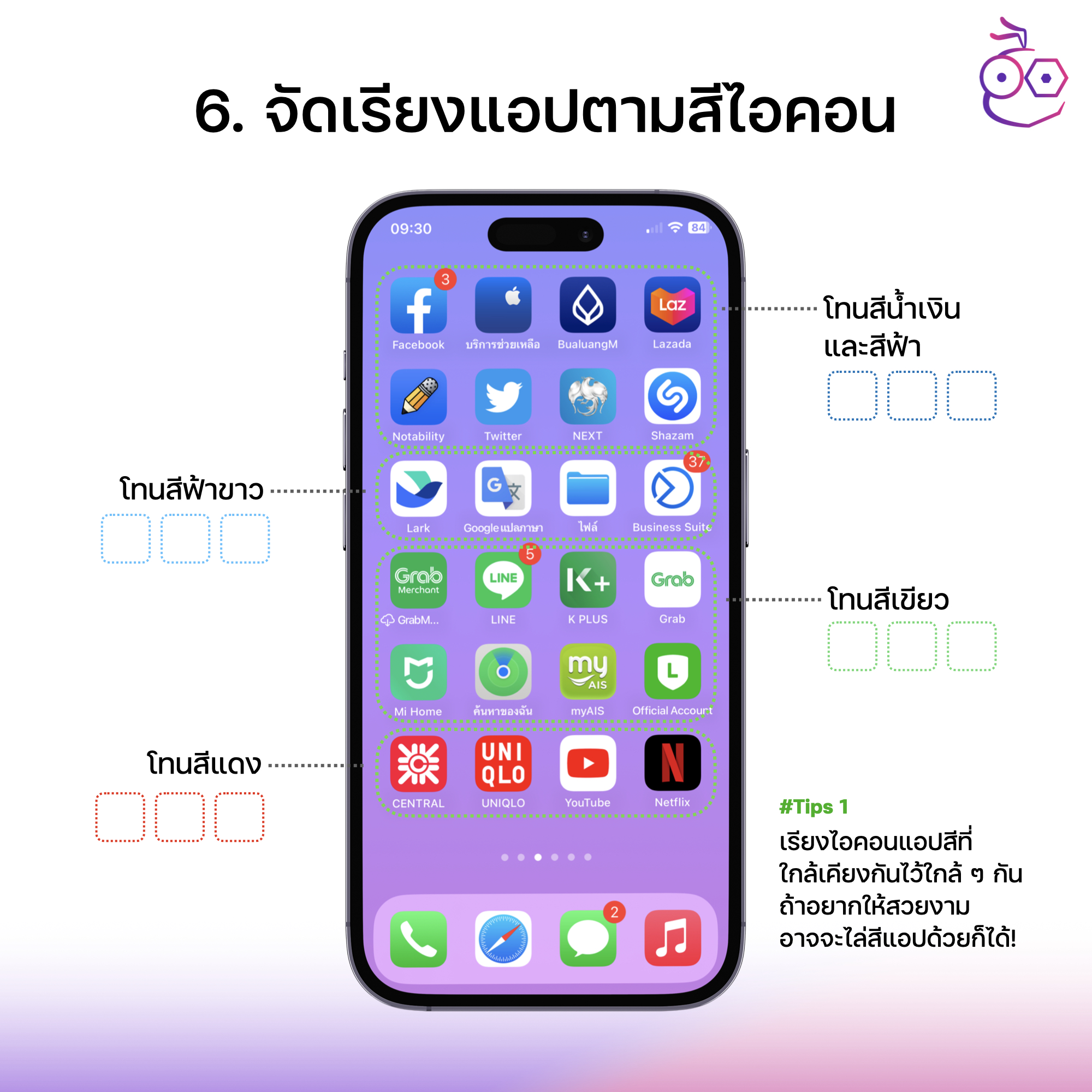 หมายเหตุ บางไอเดียเหมาะสำหรับคนที่ชอบนำแอปมาไว้บนหน้าโฮมเป็นจำนวนมากนะคะ สำหรับใครที่นำแอปมาไว้บนหน้าโฮมไม่เยอะและสะดวกในการใช้ไลบรารี่อยู่แล้ว ก็อาจจะเลือกบางไอเดียไปจัดเรียงแอปกันได้นะคะ